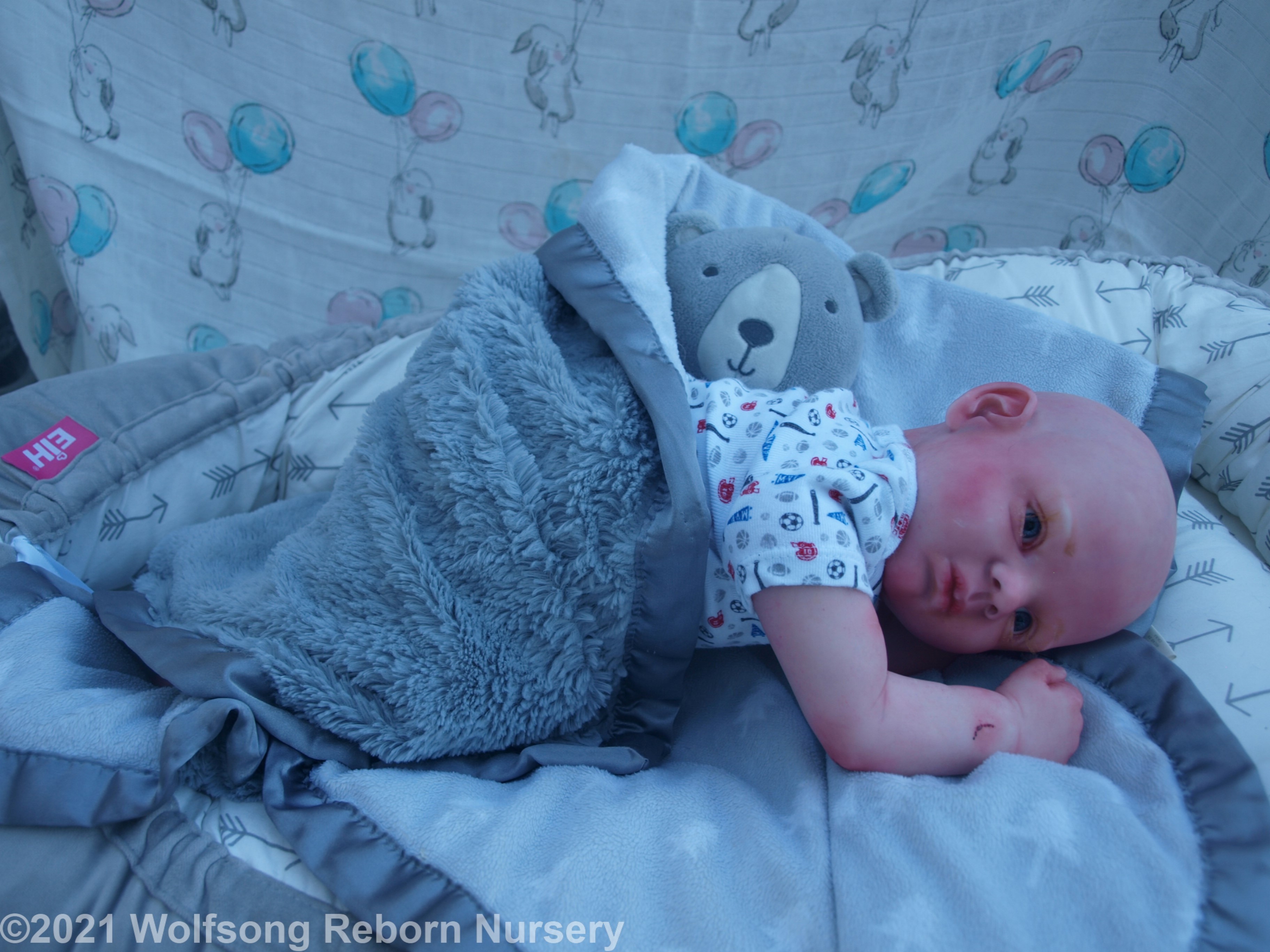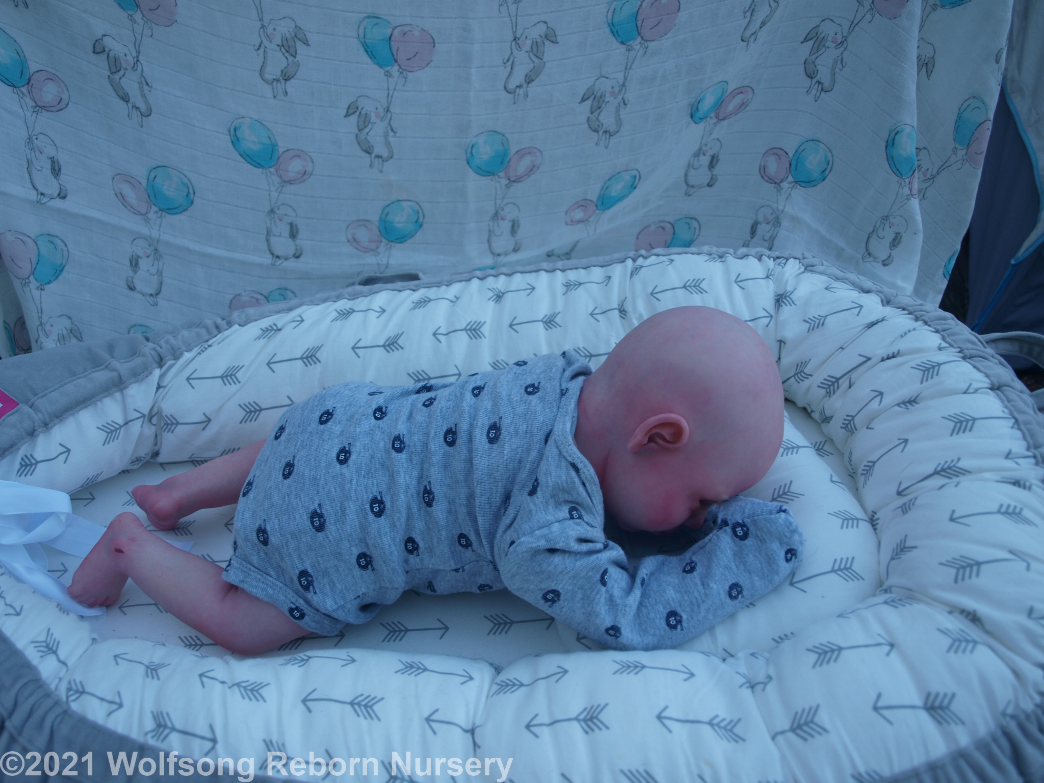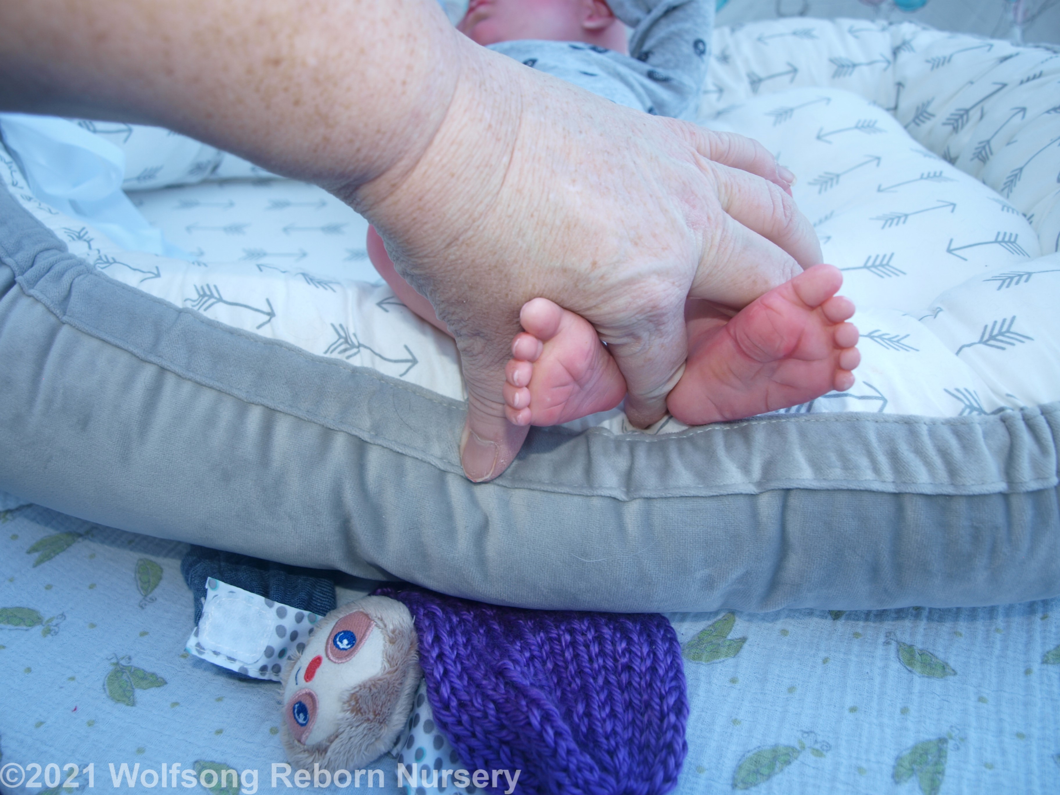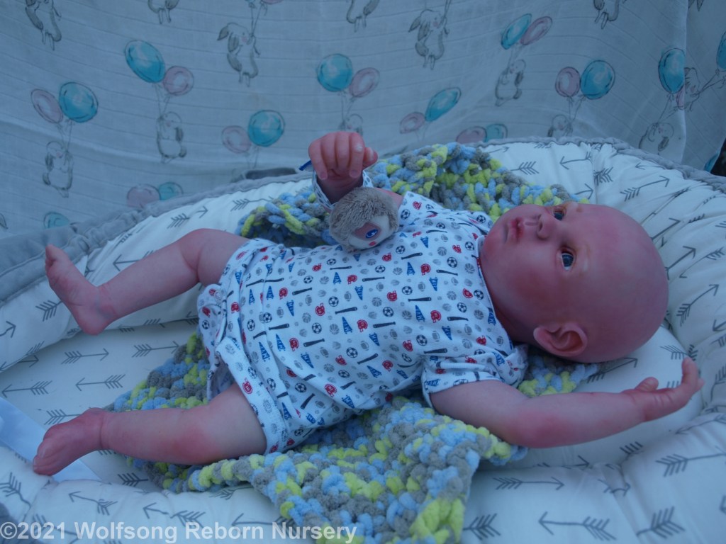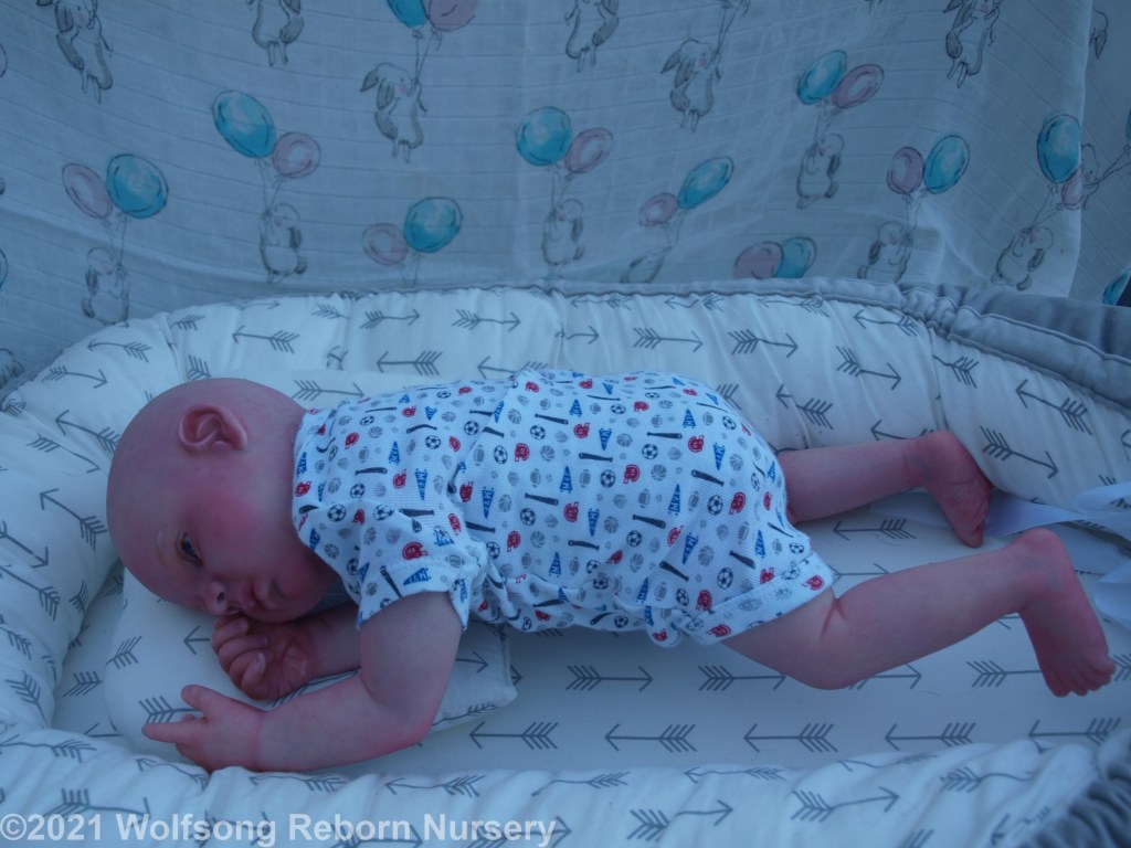 This is the Bountiful Baby Limited Edition 2021 ROSE Kit of the year Sandy reborned by Marta Towne of Wolfsong Reborn Nursery. Sandy is created on a second’s kit ad is being sold as a Boo Boo baby. I have been reborning since March and this is my ninth baby, so I have a lot to learn, but she is a precious baby made with a lot of love and attention to detail. Sandy has been reborned using Miracle Blend Air Dry Paint and Coastal Secents powders and is weighted with glass beads and filled with two types of polyfill. The head and all four limbs are attached using rings to allow a wide variety of poses.. Sandy has acrylic blue eyes from Bountiful Baby and lovely, hand rooted long lashes. Sandy has a magnet behind the lips for a magnetic pacifier as well as one on the inside of the head for a magnetic hair decoration (enclosed if selected as a girl) . Sandy’s head must be supported, just like a real baby. Sandy has a scratch on one little arm and elbow from too sharp baby nails, but has had a manicure now.