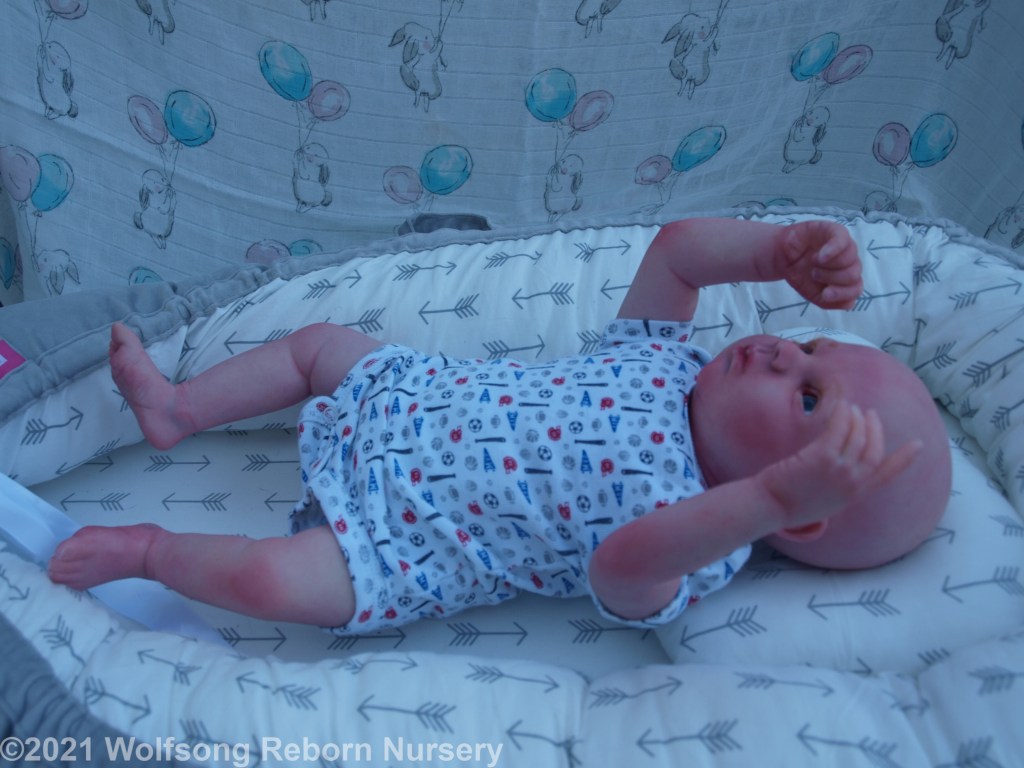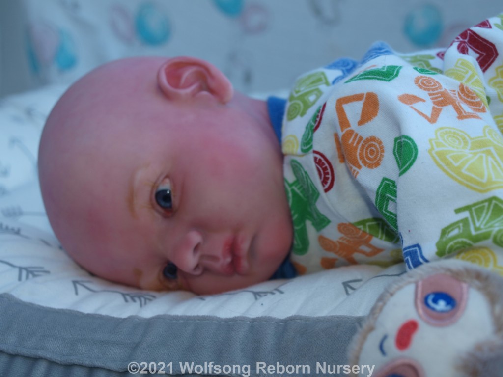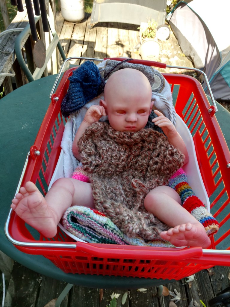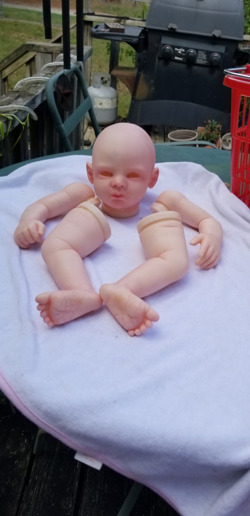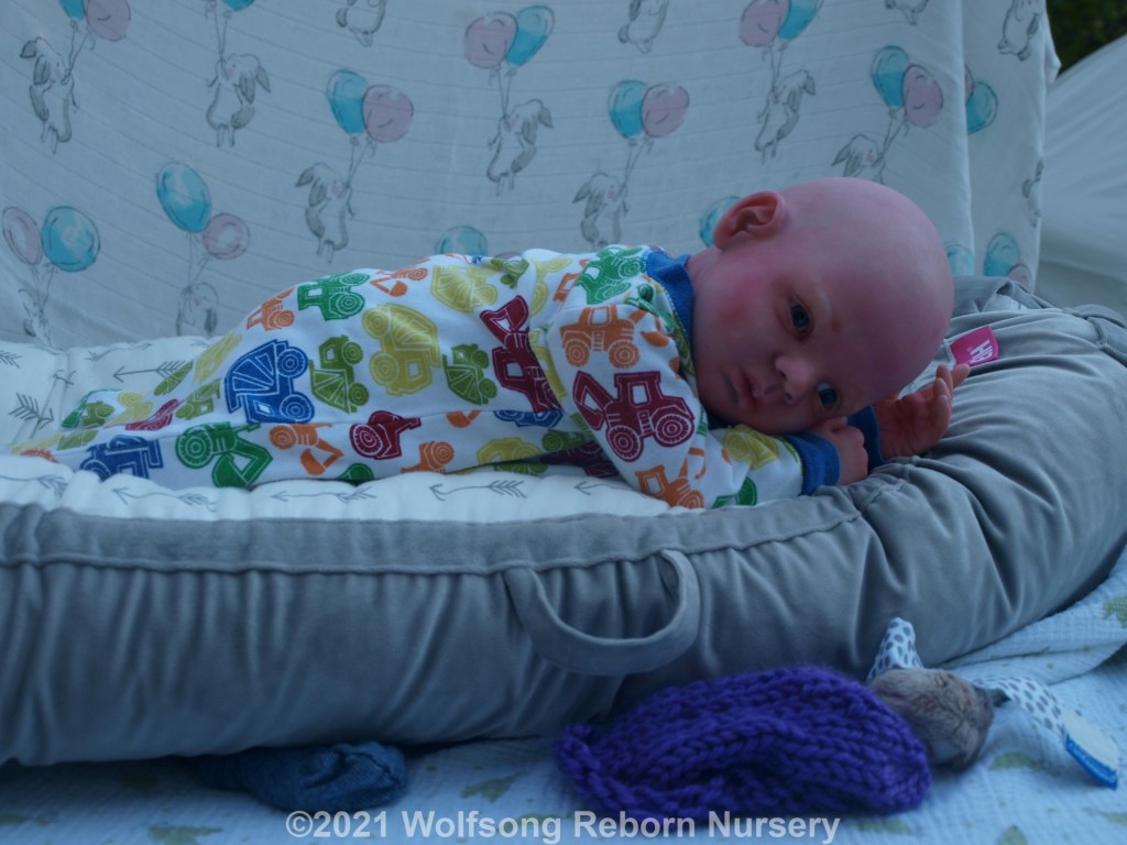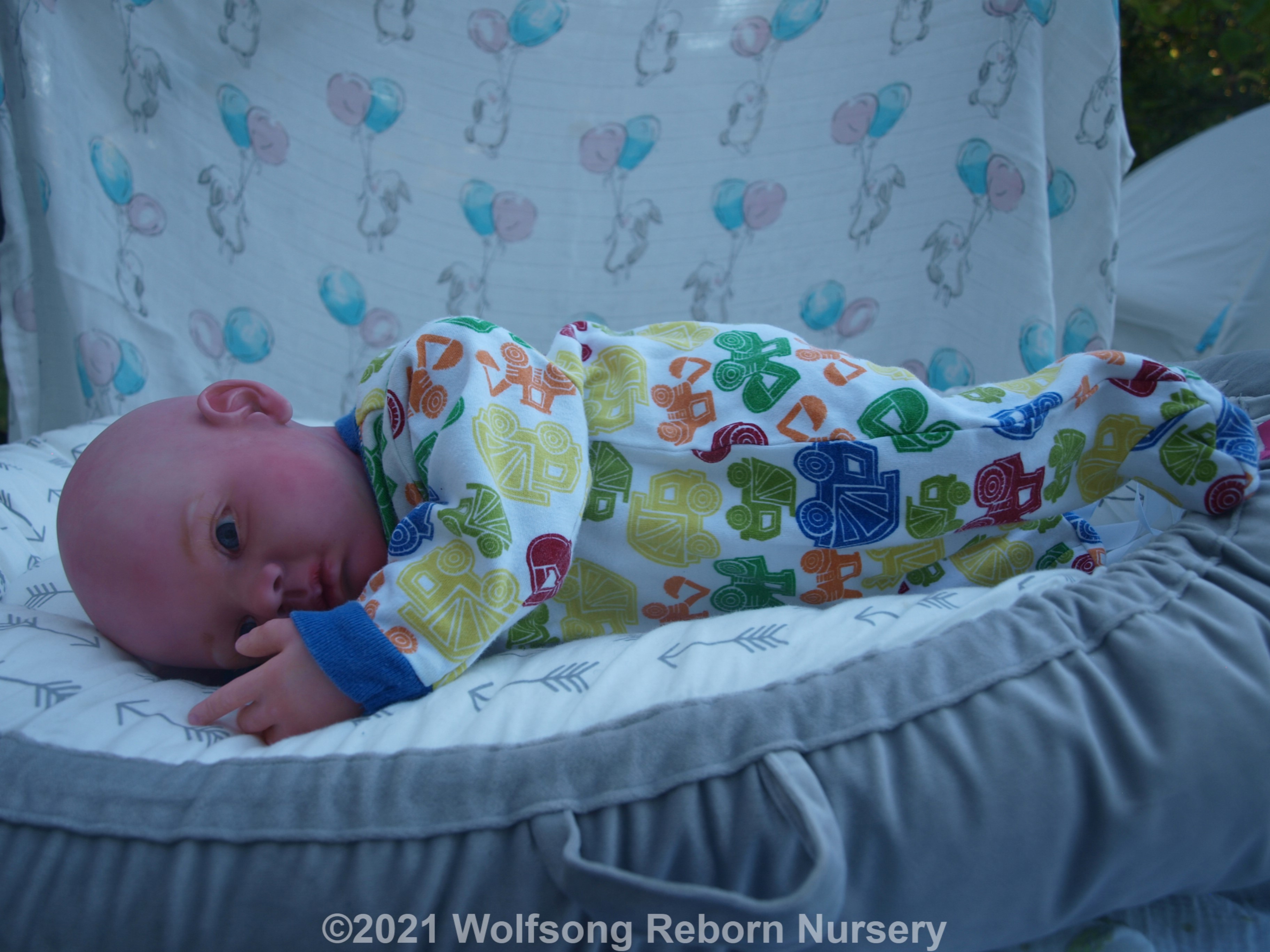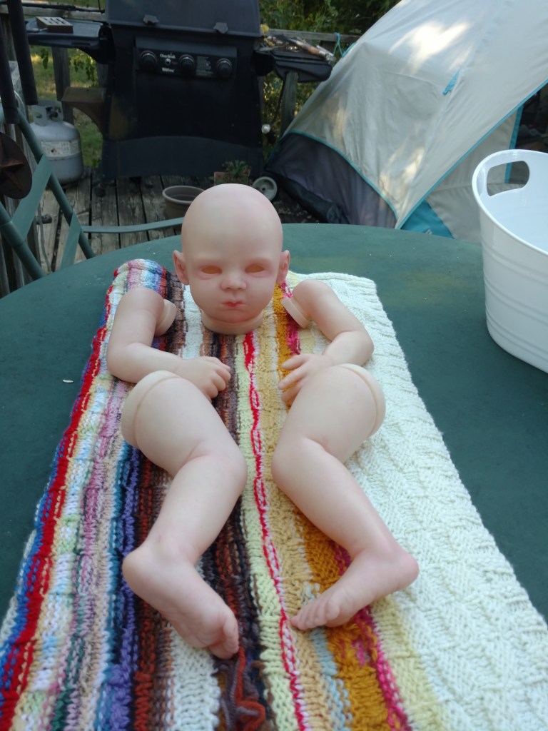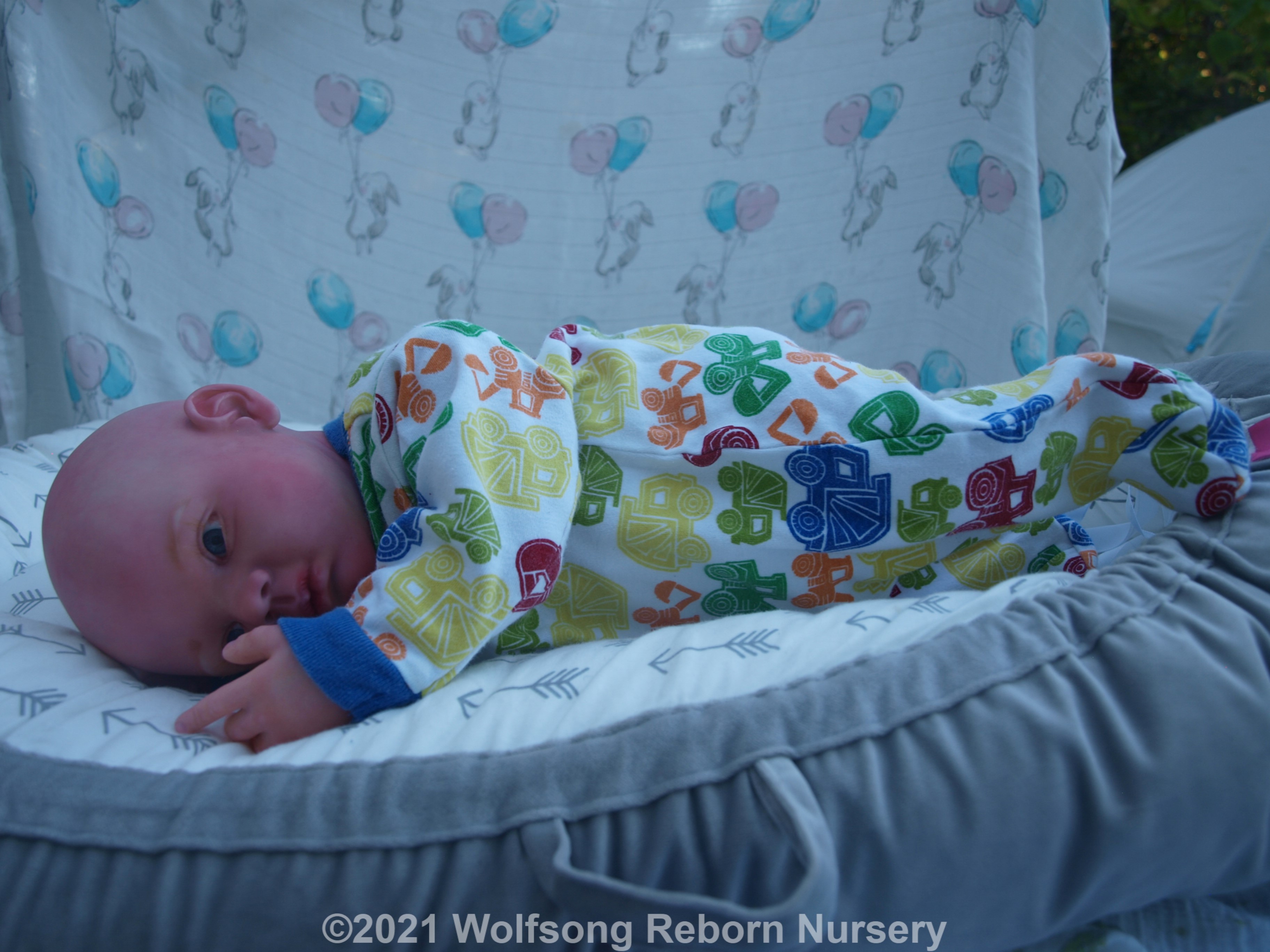 This is the Bountiful Baby Limited Edition 2021 ROSE Kit of the year Sandy reborned by Marta Towne of Wolfsong Reborn Nursery. Sandy is created on a second’s kit ad is being sold as a Boo Boo baby. I have been reborning since March and this is my ninth baby, so I have a lot to learn, but she is a precious baby made with a lot of love and attention to detail. Sandy has been reborned using Miracle Blend Air Dry Paint and Coastal Secents powders and is weighted with glass beads and filled with two types of polyfill. The head and all four limbs are attached using rings to allow a wide variety of poses.. Sandy has acrylic blue eyes from Bountiful Baby and lovely, hand rooted long lashes. Sandy has a magnet behind the lips for a magnetic pacifier as well as one on the inside of the head for a magnetic hair decoration (enclosed if selected as a girl) . Sandy’s head must be supported, just like a real baby. Sandy has a scratch on one little arm and elbow from too sharp baby nails, but has had a manicure now.