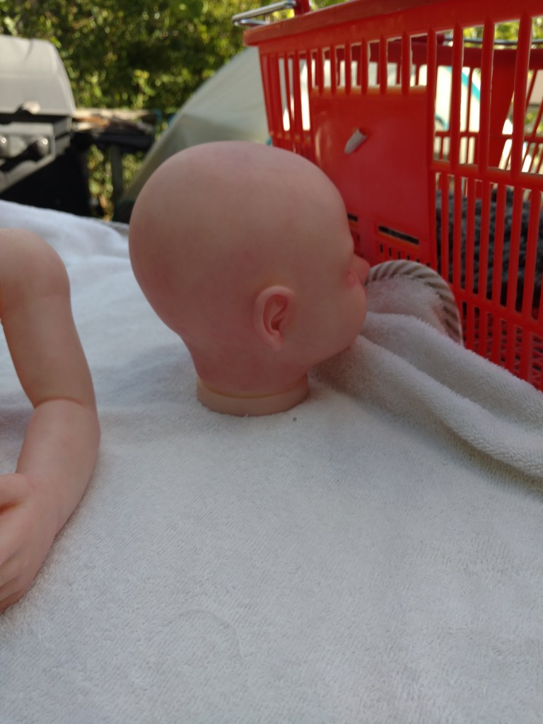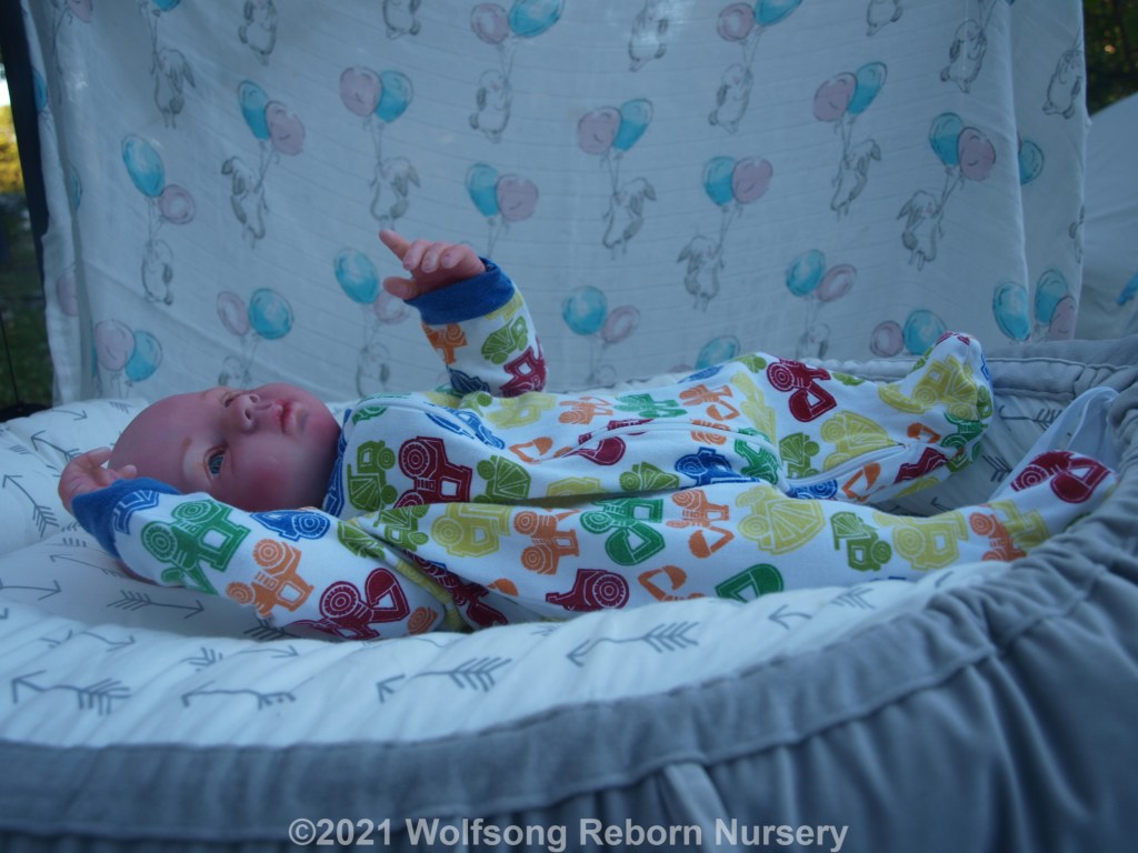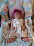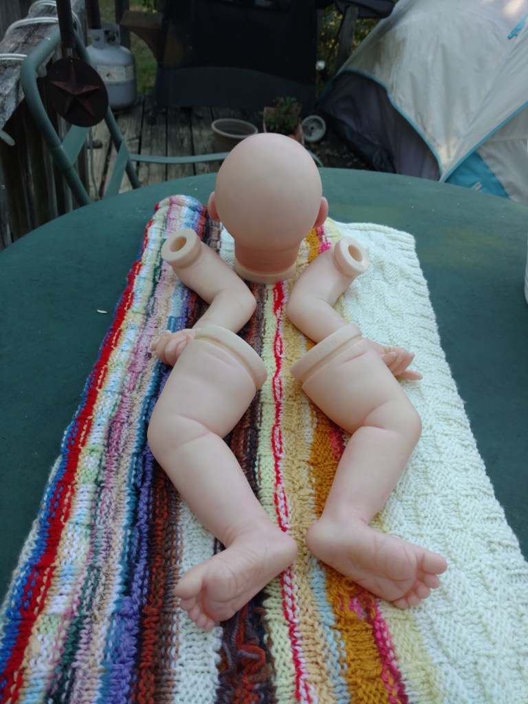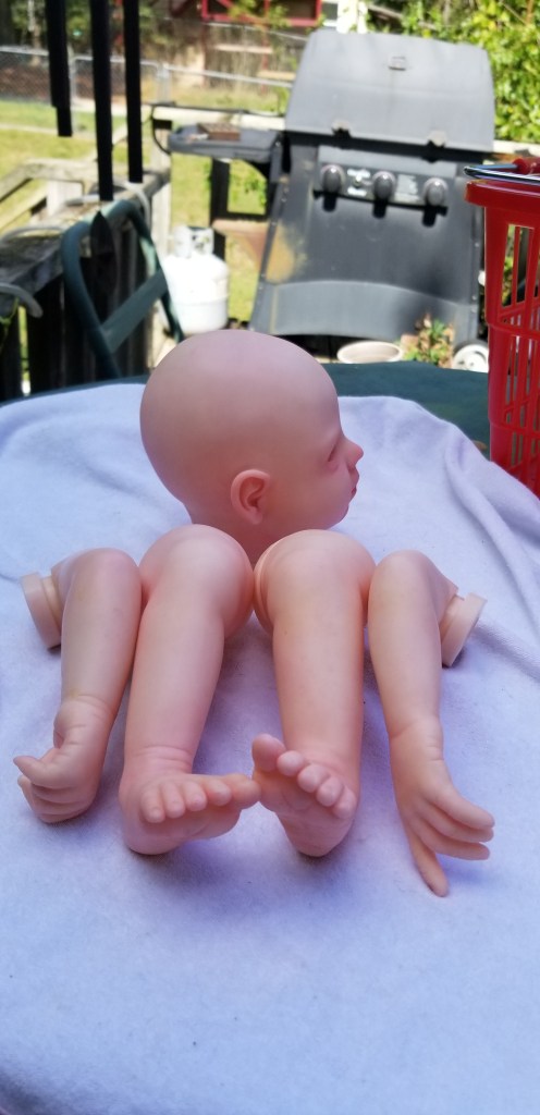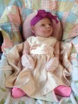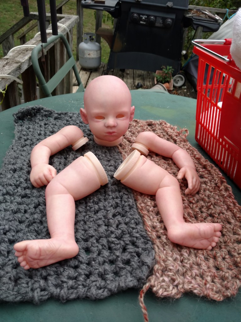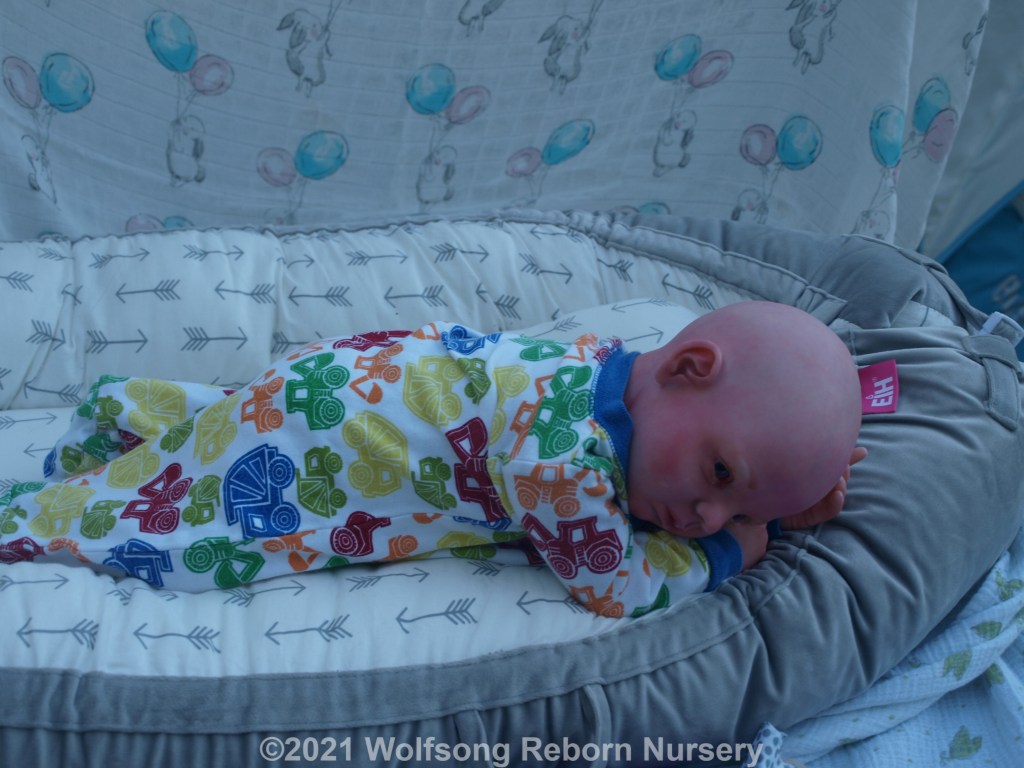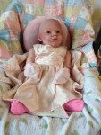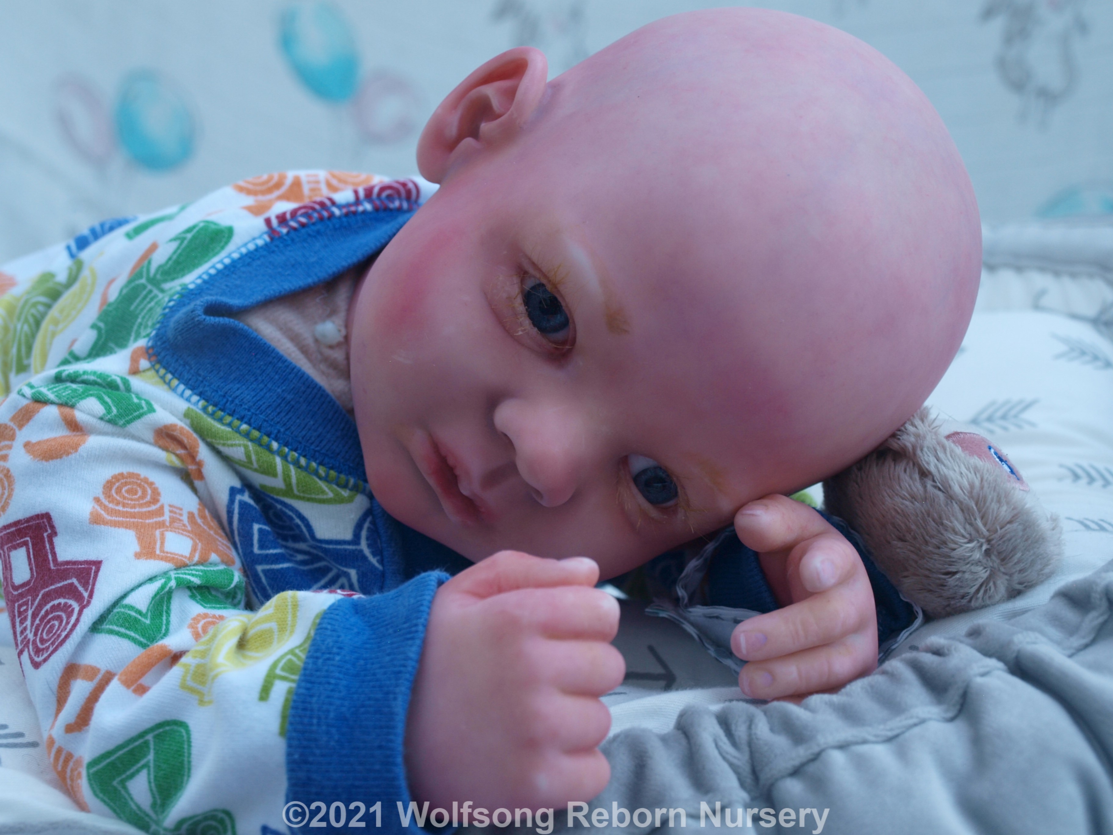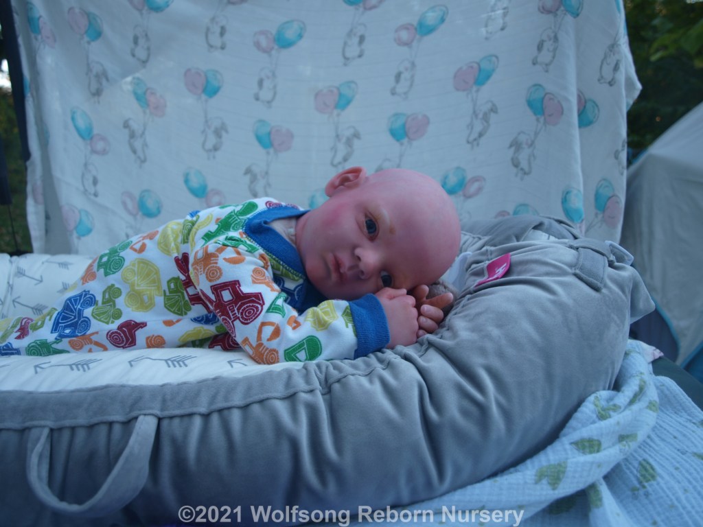 This is the Bountiful Baby Limited Edition 2021 ROSE Kit of the year Sandy reborned by Marta Towne of Wolfsong Reborn Nursery. Sandy is created on a second’s kit ad is being sold as a Boo Boo baby. I have been reborning since March and this is my ninth baby, so I have a lot to learn, but she is a precious baby made with a lot of love and attention to detail. Sandy has been reborned using Miracle Blend Air Dry Paint and Coastal Secents powders and is weighted with glass beads and filled with two types of polyfill. The head and all four limbs are attached using rings to allow a wide variety of poses.. Sandy has acrylic blue eyes from Bountiful Baby and lovely, hand rooted long lashes. Sandy has a magnet behind the lips for a magnetic pacifier as well as one on the inside of the head for a magnetic hair decoration (enclosed if selected as a girl) . Sandy’s head must be supported, just like a real baby. Sandy has a scratch on one little arm and elbow from too sharp baby nails, but has had a manicure now.