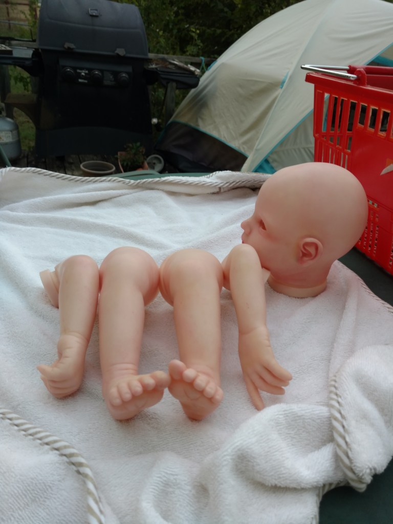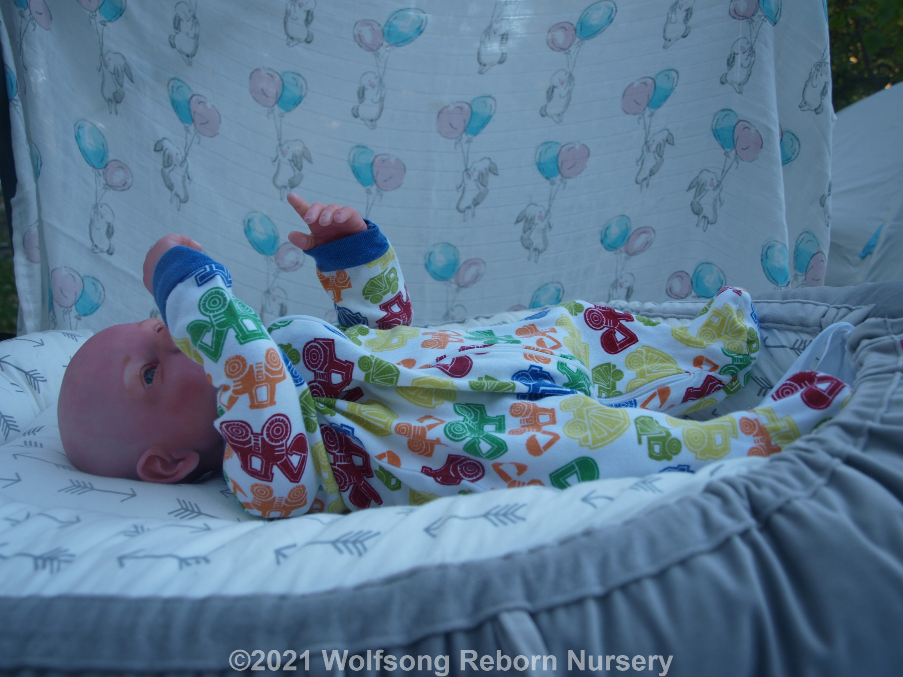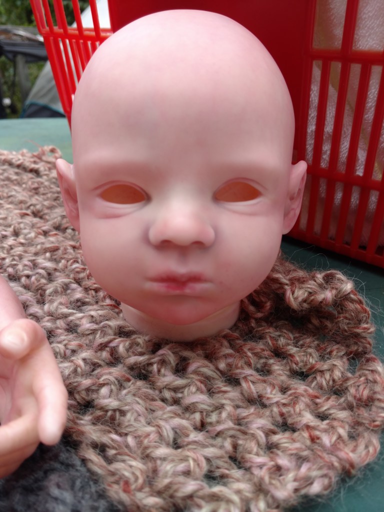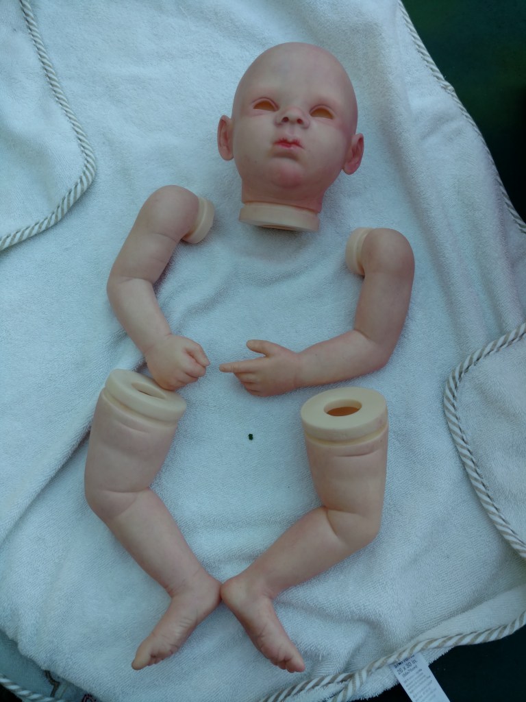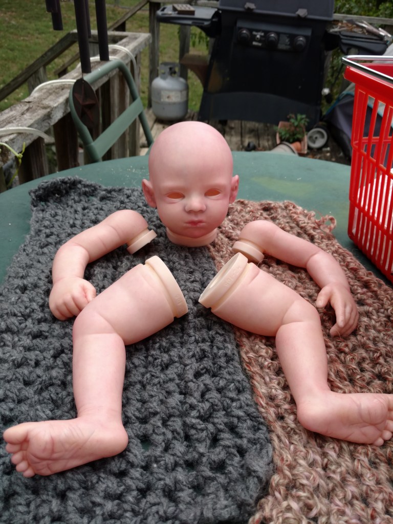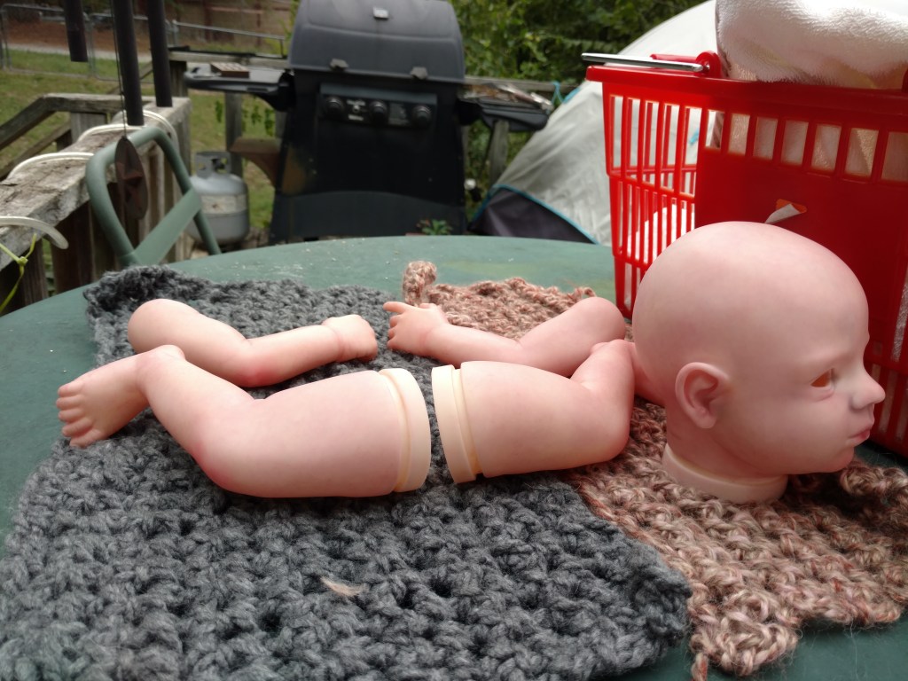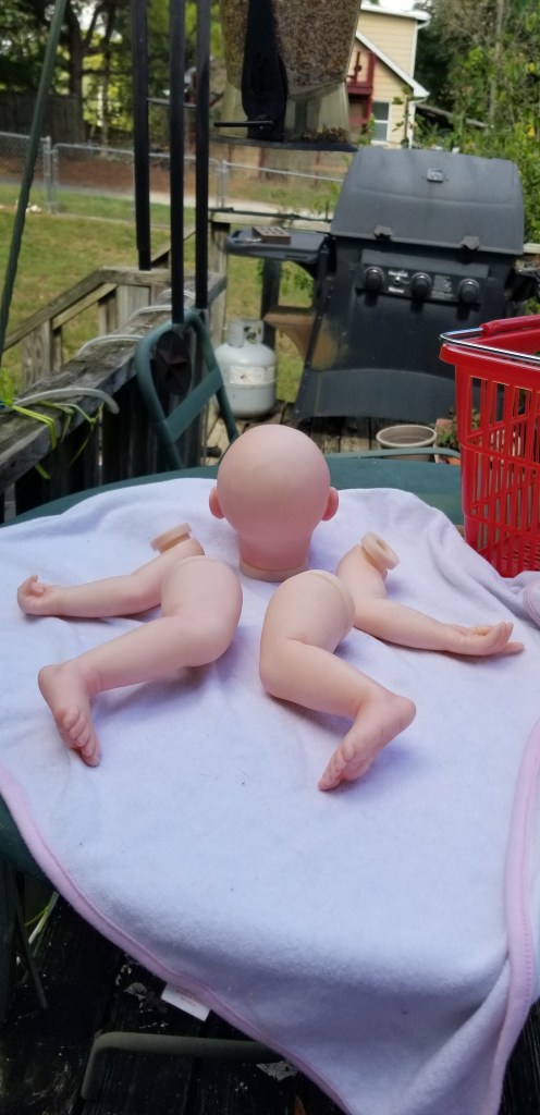 This is the Bountiful Baby Limited Edition 2021 ROSE Kit of the year Sandy reborned by Marta Towne of Wolfsong Reborn Nursery. Sandy is created on a second’s kit ad is being sold as a Boo Boo baby. I have been reborning since March and this is my ninth baby, so I have a lot to learn, but she is a precious baby made with a lot of love and attention to detail. Sandy has been reborned using Miracle Blend Air Dry Paint and Coastal Secents powders and is weighted with glass beads and filled with two types of polyfill. The head and all four limbs are attached using rings to allow a wide variety of poses.. Sandy has acrylic blue eyes from Bountiful Baby and lovely, hand rooted long lashes. Sandy has a magnet behind the lips for a magnetic pacifier as well as one on the inside of the head for a magnetic hair decoration (enclosed if selected as a girl) . Sandy’s head must be supported, just like a real baby. Sandy has a scratch on one little arm and elbow from too sharp baby nails, but has had a manicure now.