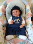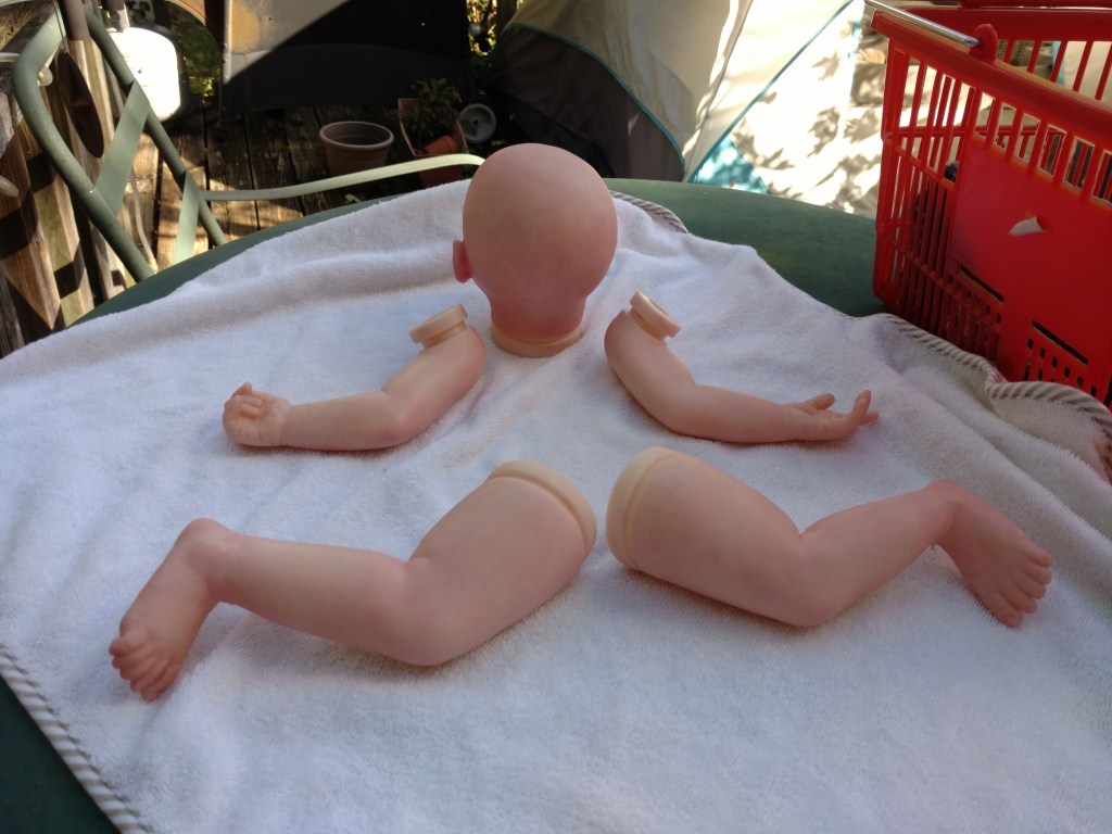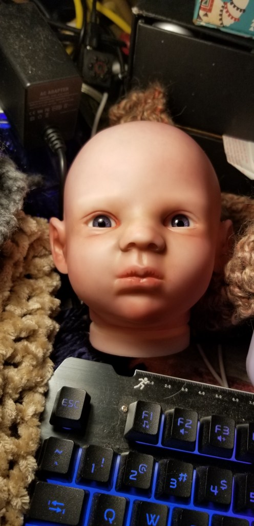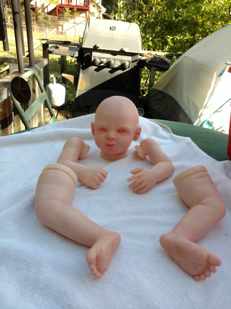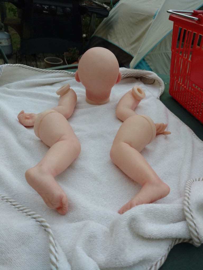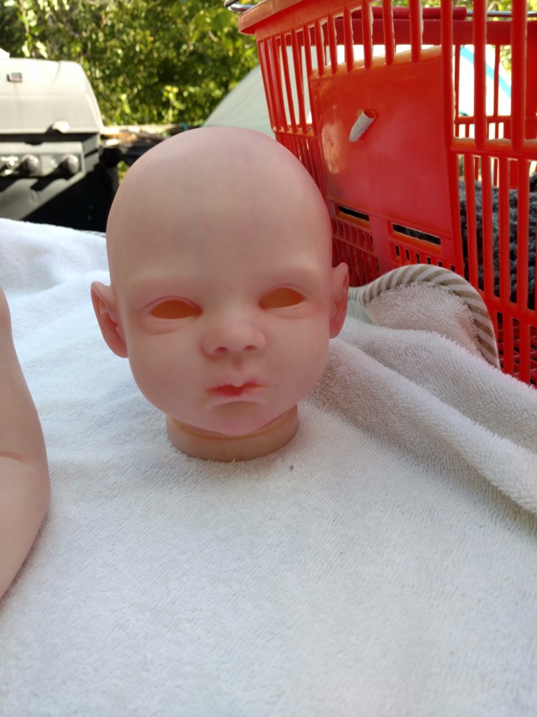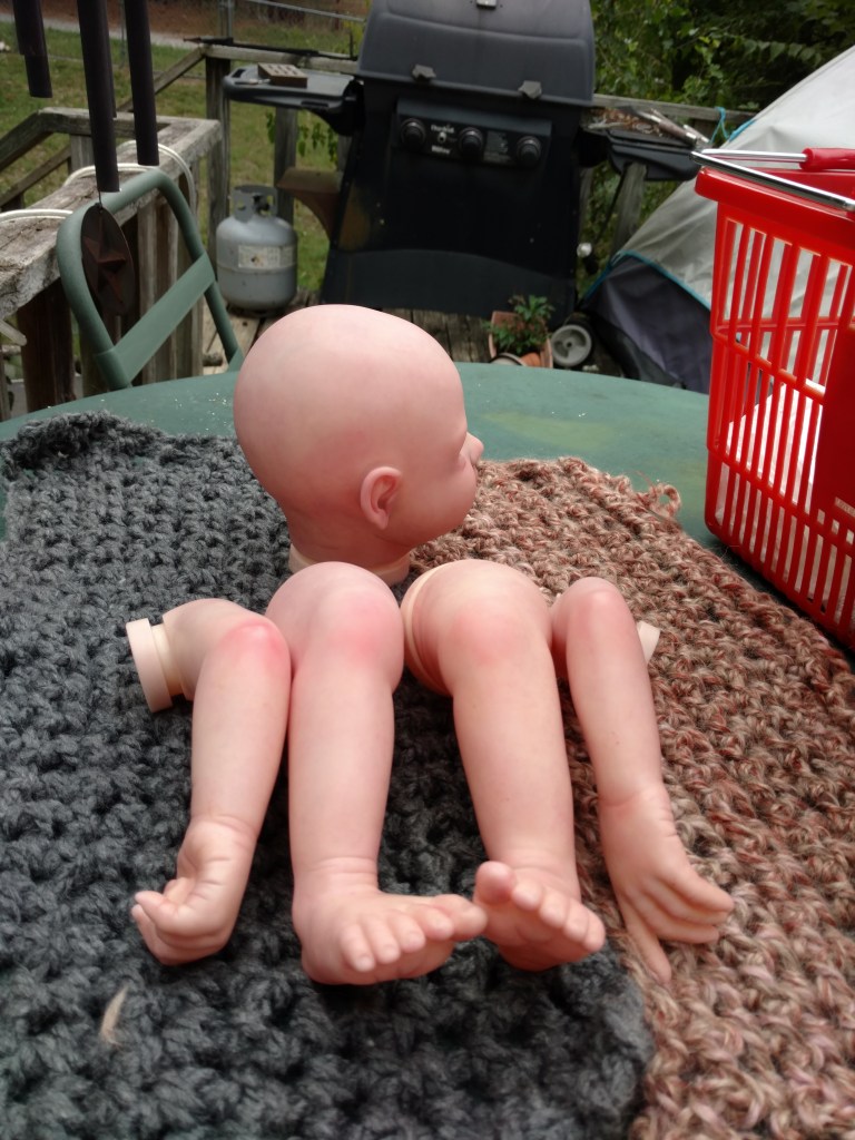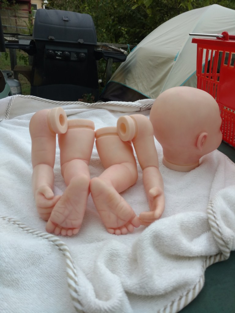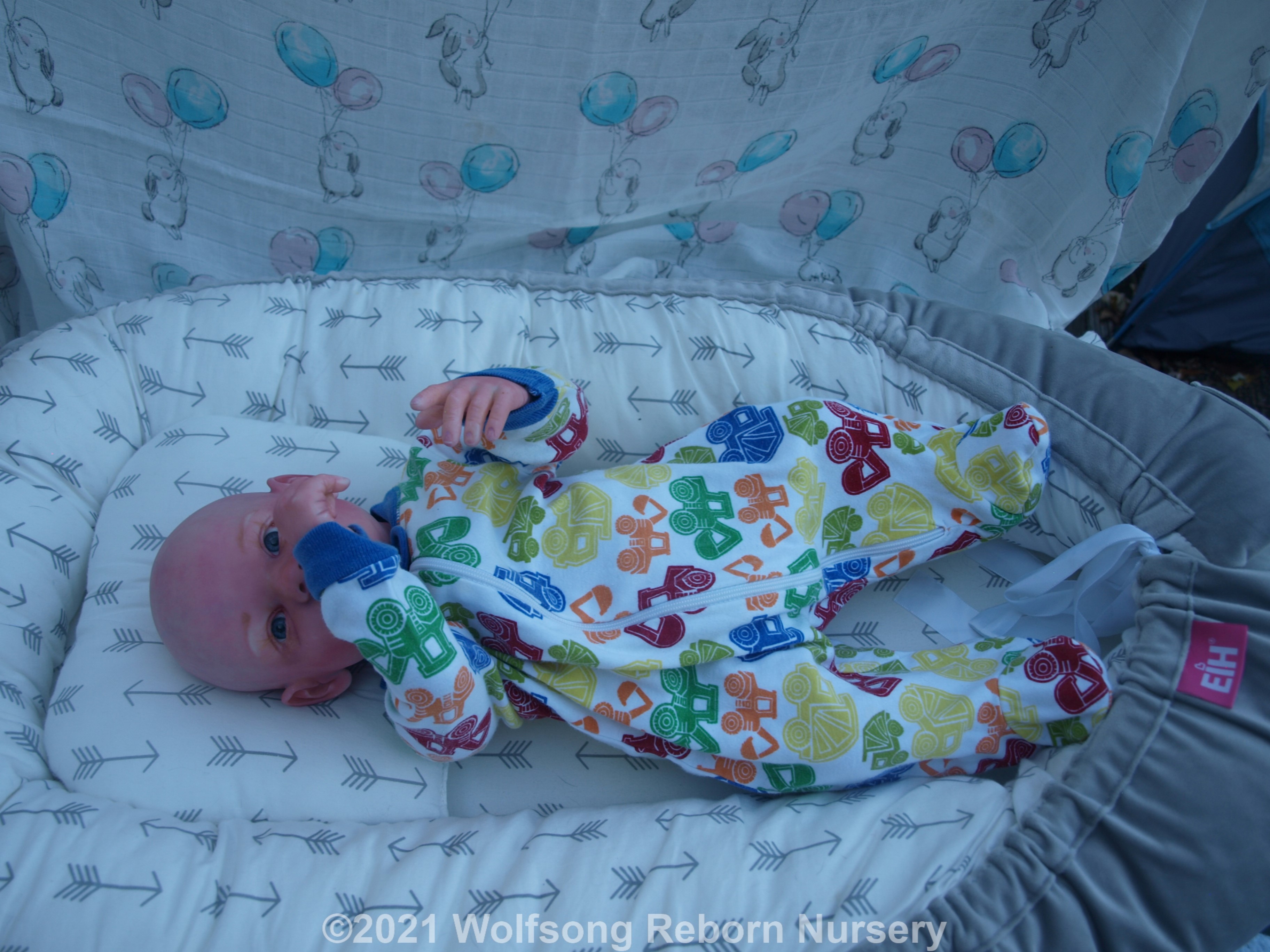 This is the Bountiful Baby Limited Edition 2021 ROSE Kit of the year Sandy reborned by Marta Towne of Wolfsong Reborn Nursery. Sandy is created on a second’s kit ad is being sold as a Boo Boo baby. I have been reborning since March and this is my ninth baby, so I have a lot to learn, but she is a precious baby made with a lot of love and attention to detail. Sandy has been reborned using Miracle Blend Air Dry Paint and Coastal Secents powders and is weighted with glass beads and filled with two types of polyfill. The head and all four limbs are attached using rings to allow a wide variety of poses.. Sandy has acrylic blue eyes from Bountiful Baby and lovely, hand rooted long lashes. Sandy has a magnet behind the lips for a magnetic pacifier as well as one on the inside of the head for a magnetic hair decoration (enclosed if selected as a girl) . Sandy’s head must be supported, just like a real baby. Sandy has a scratch on one little arm and elbow from too sharp baby nails, but has had a manicure now.