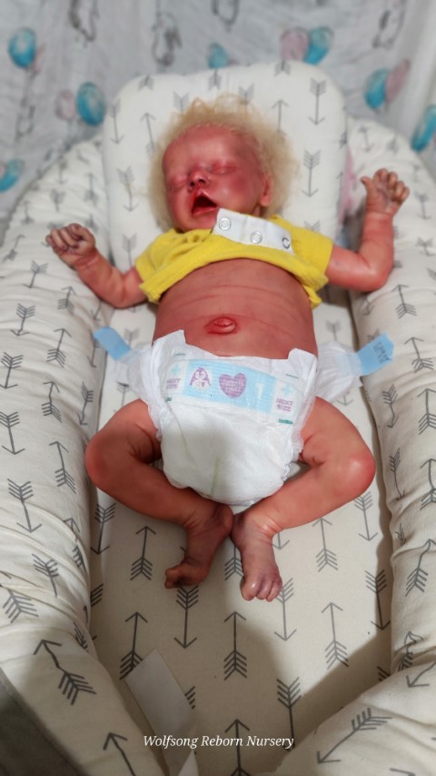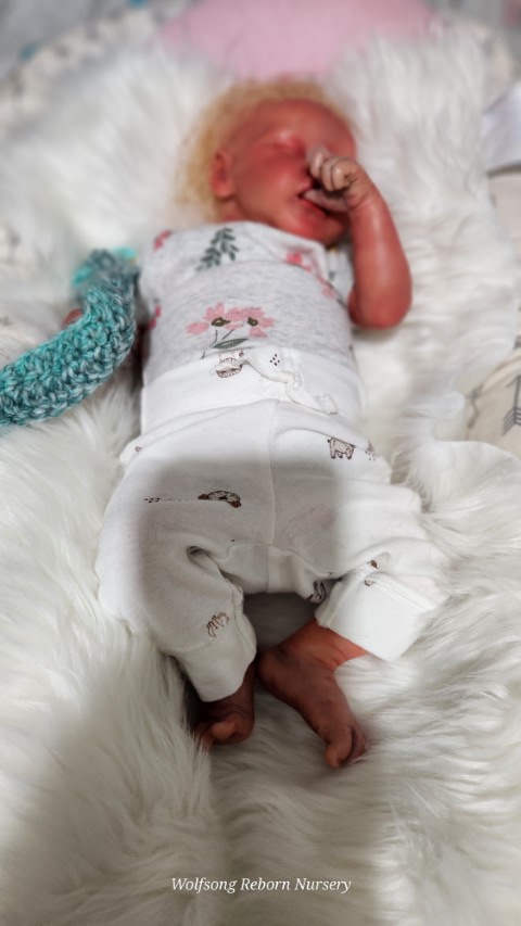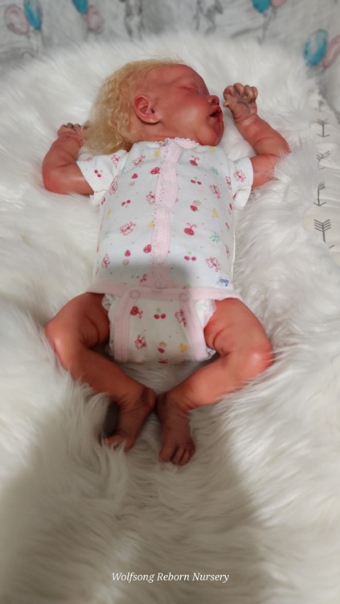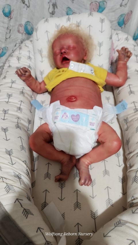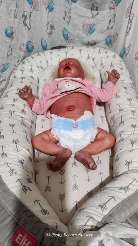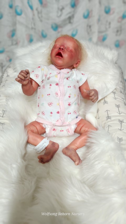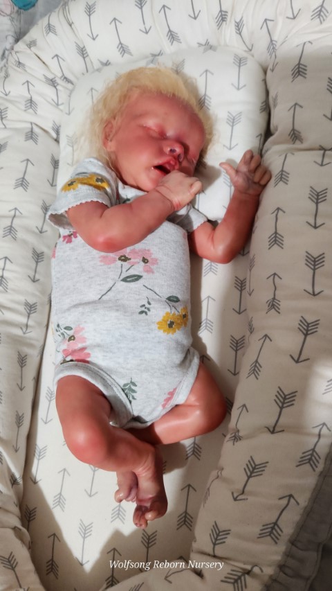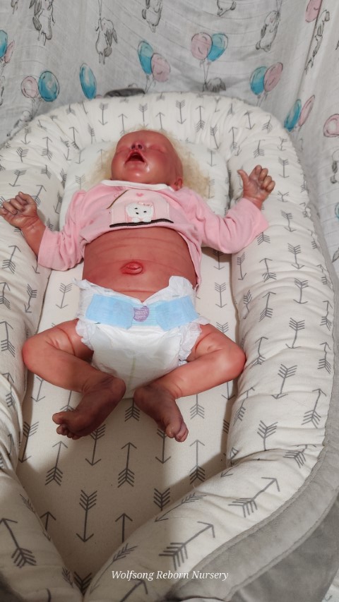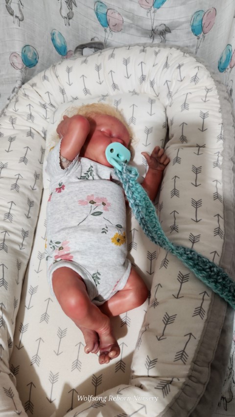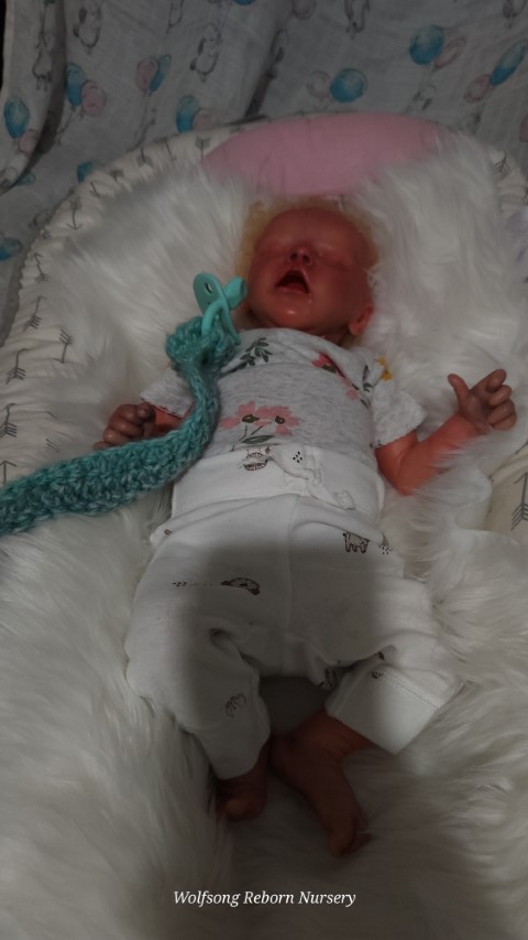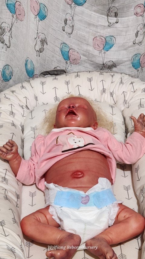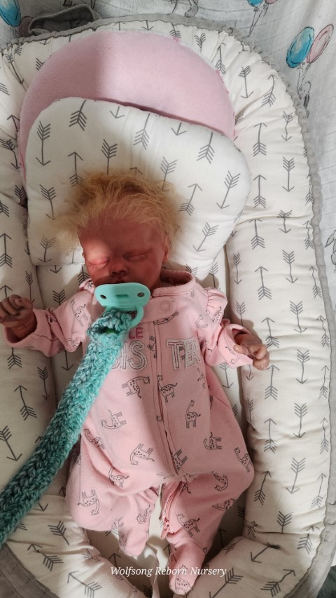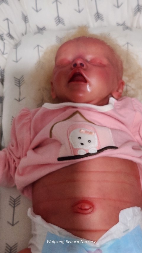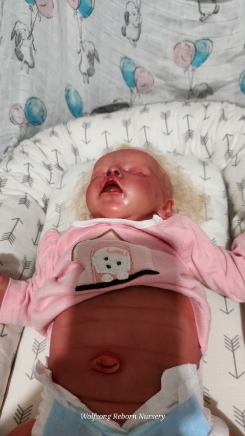 Rori has a belly plate complete with belly button and the wrinkles on her tummy. She has an open mouth that can accept a full size, newborn pacifier. Rori is hand rooted with beautiful, soft mohair from the beautiful Tammy O’Meara.