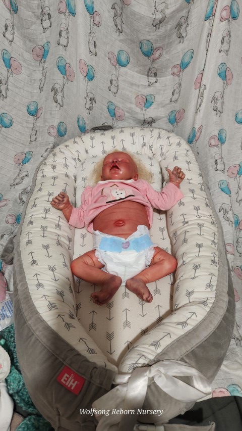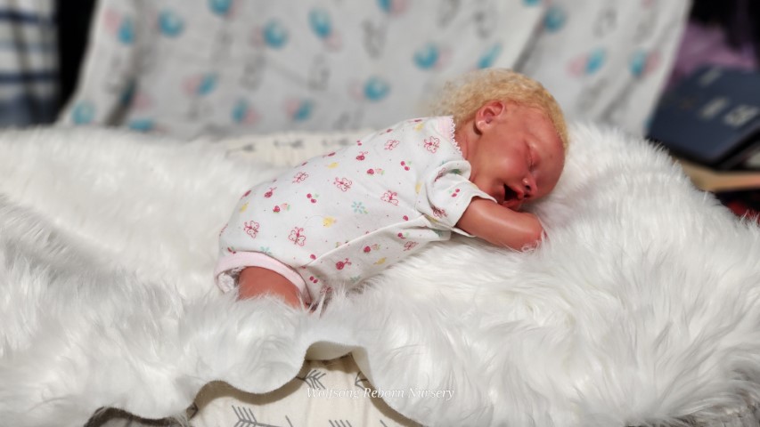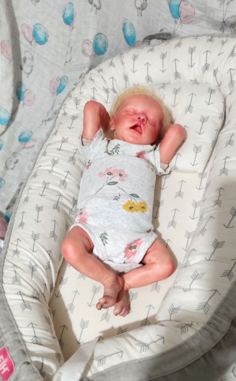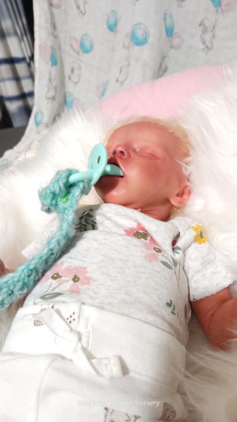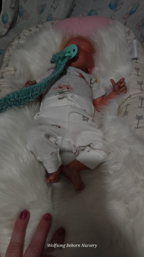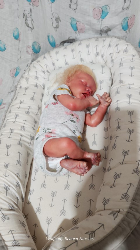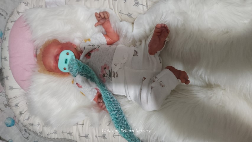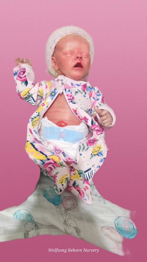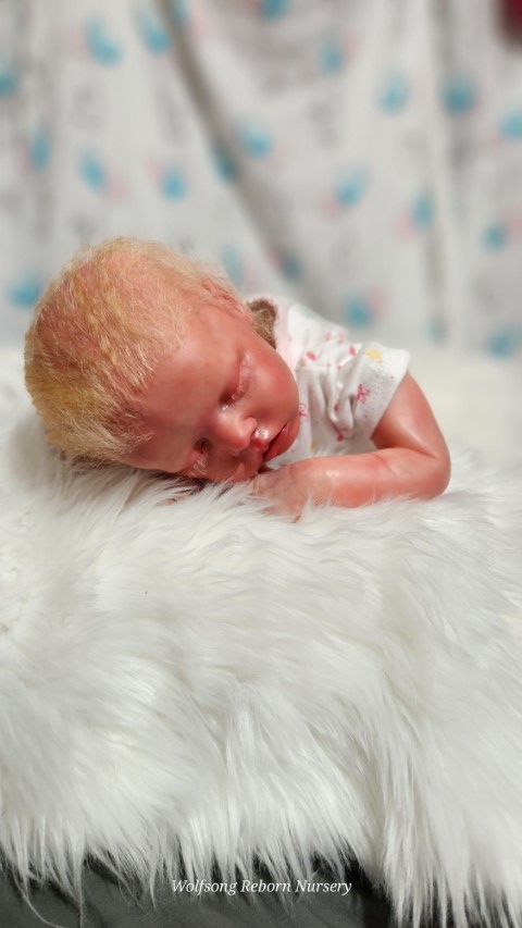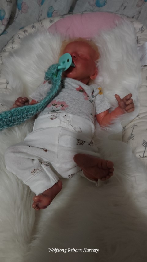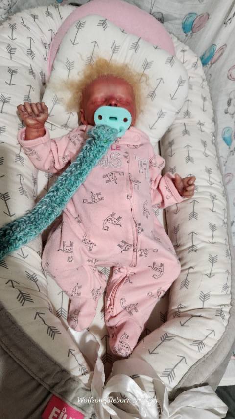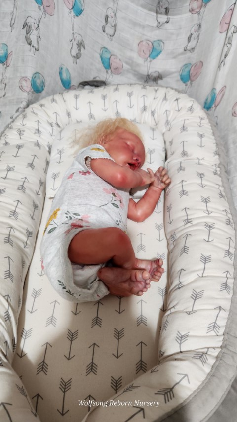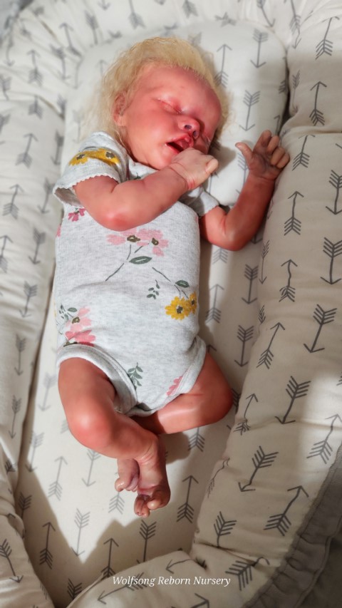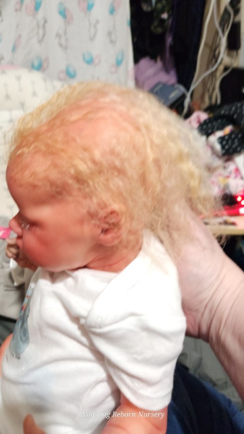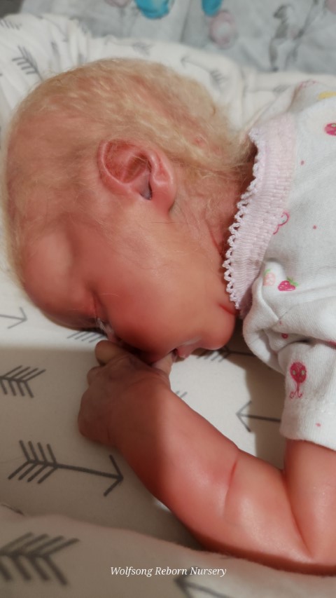 Rori has a belly plate complete with belly button and the wrinkles on her tummy. She has an open mouth that can accept a full size, newborn pacifier. Rori is hand rooted with beautiful, soft mohair from the beautiful Tammy O’Meara.