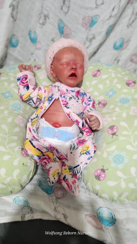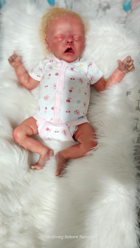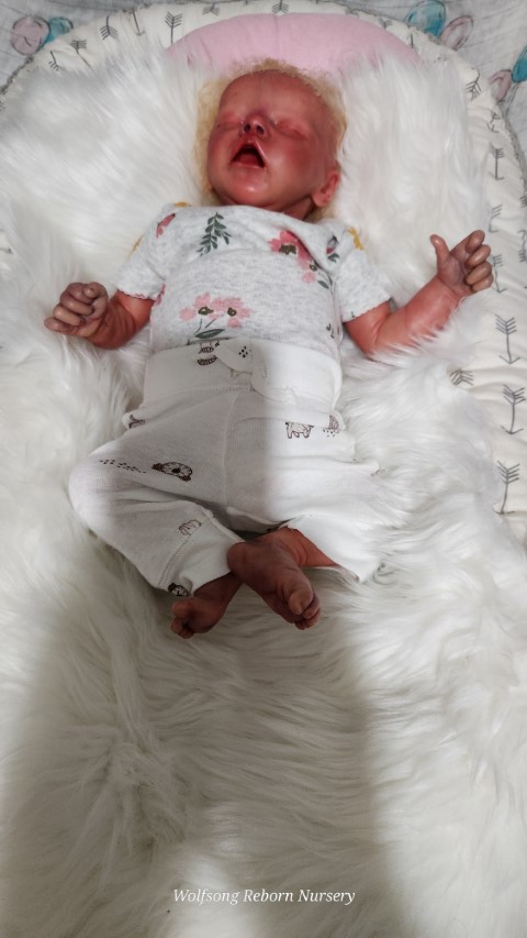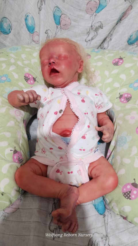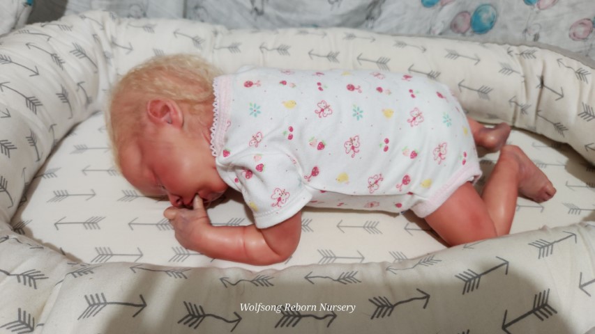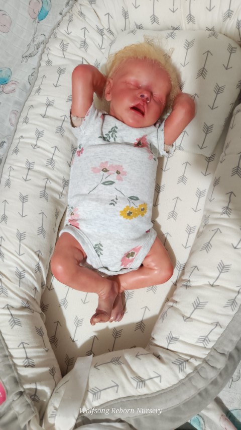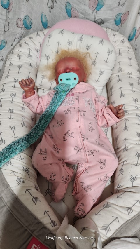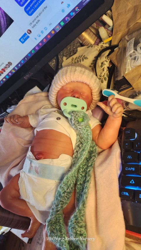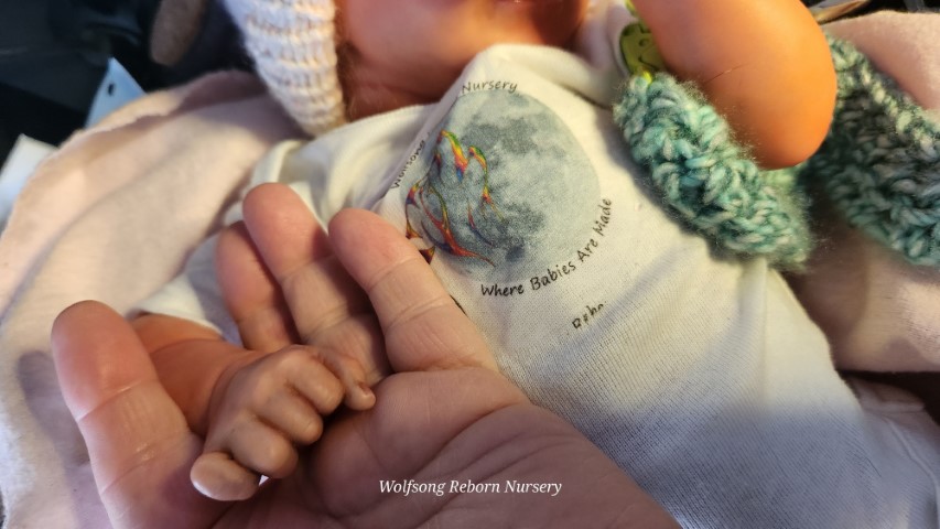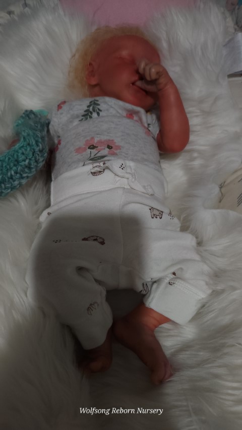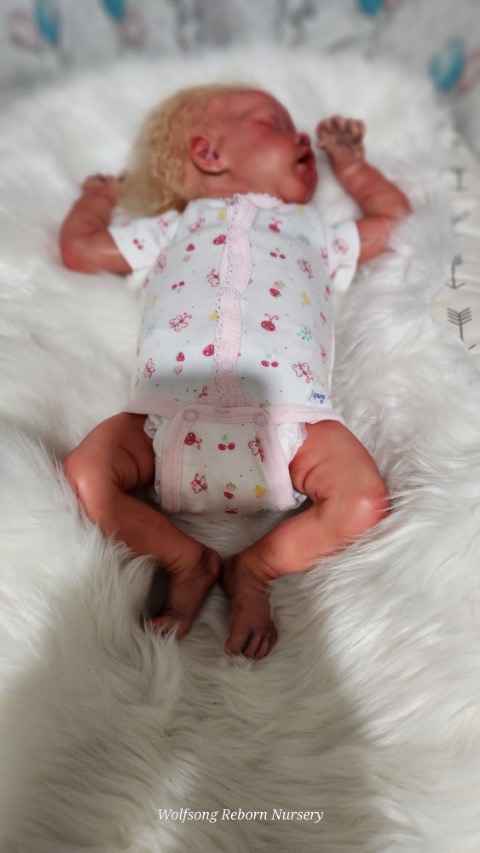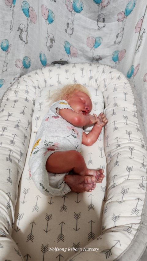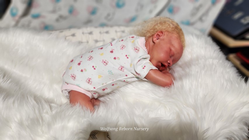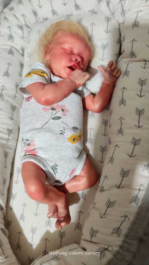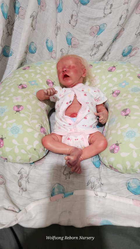 Rori has a belly plate complete with belly button and the wrinkles on her tummy. She has an open mouth that can accept a full size, newborn pacifier. Rori is hand rooted with beautiful, soft mohair from the beautiful Tammy O’Meara.