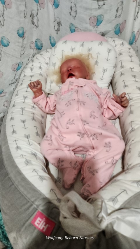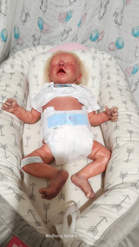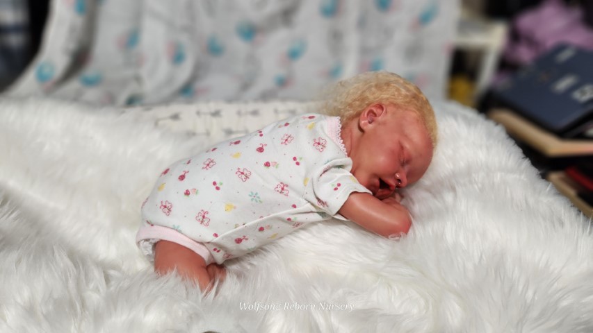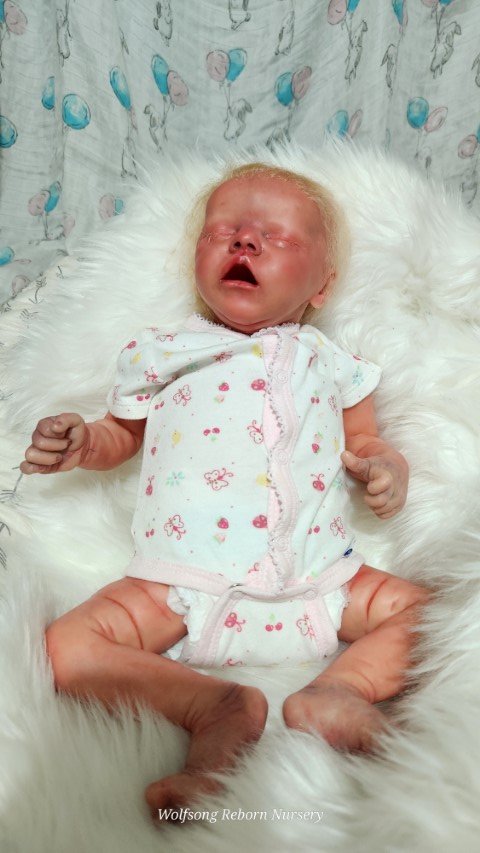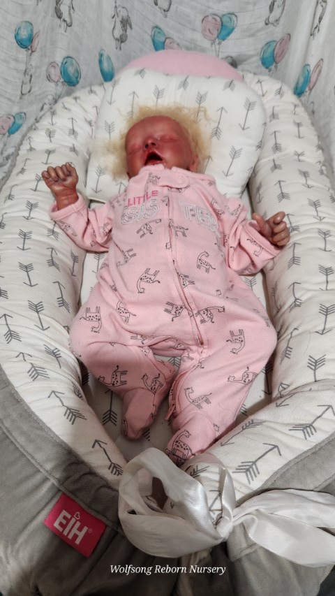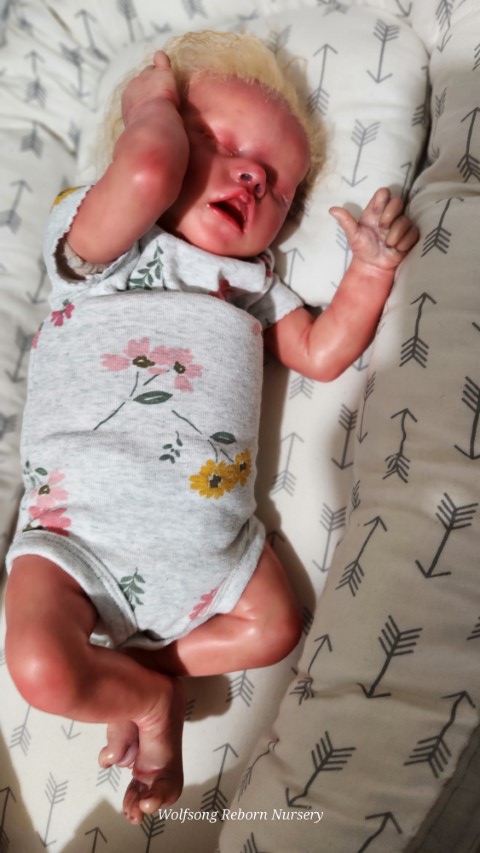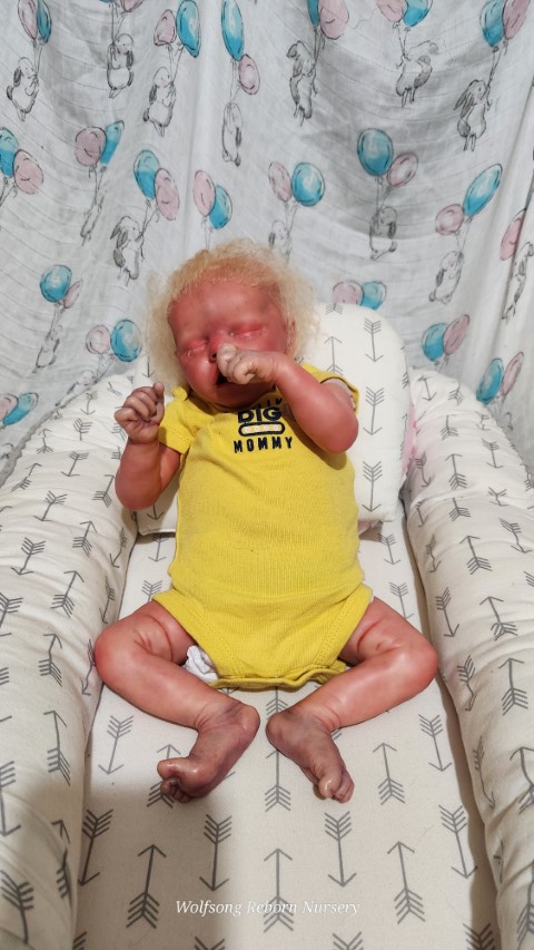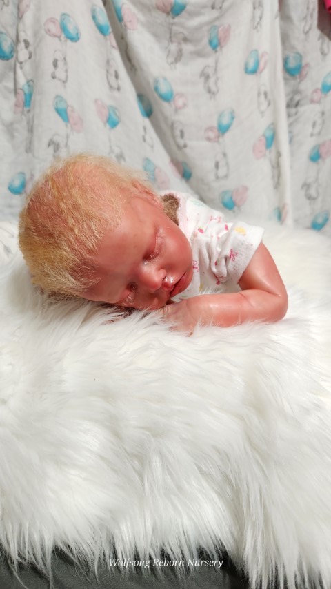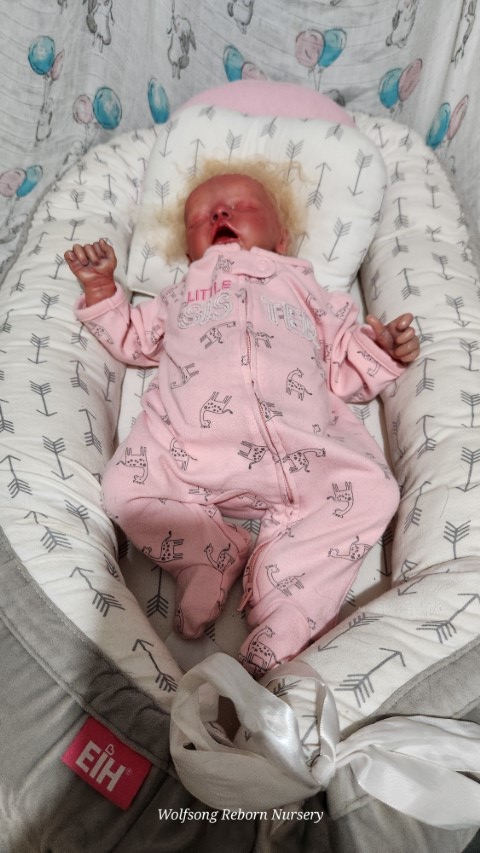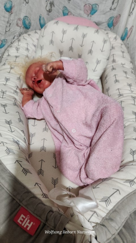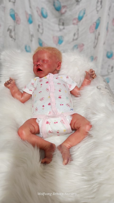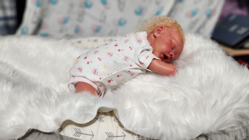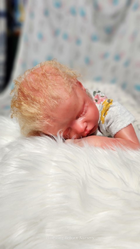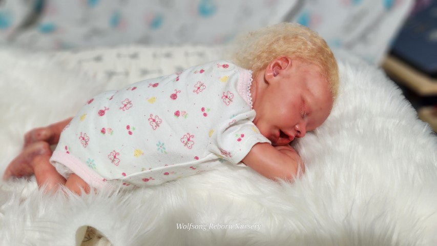 Rori has a belly plate complete with belly button and the wrinkles on her tummy. She has an open mouth that can accept a full size, newborn pacifier. Rori is hand rooted with beautiful, soft mohair from the beautiful Tammy O’Meara.