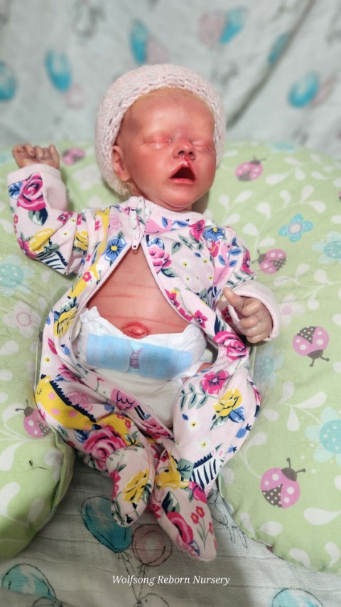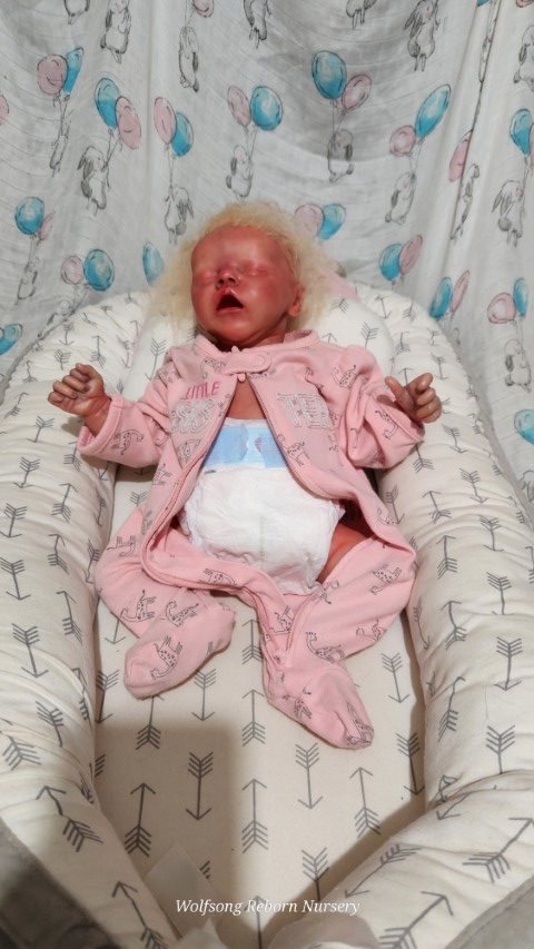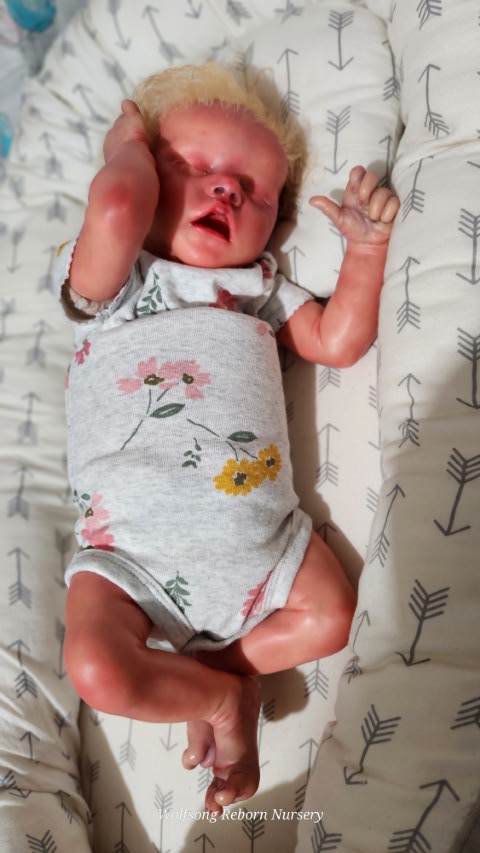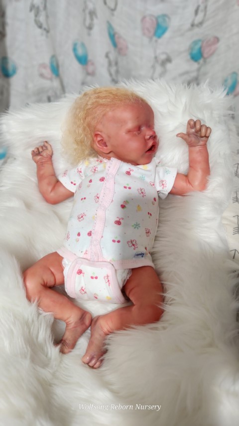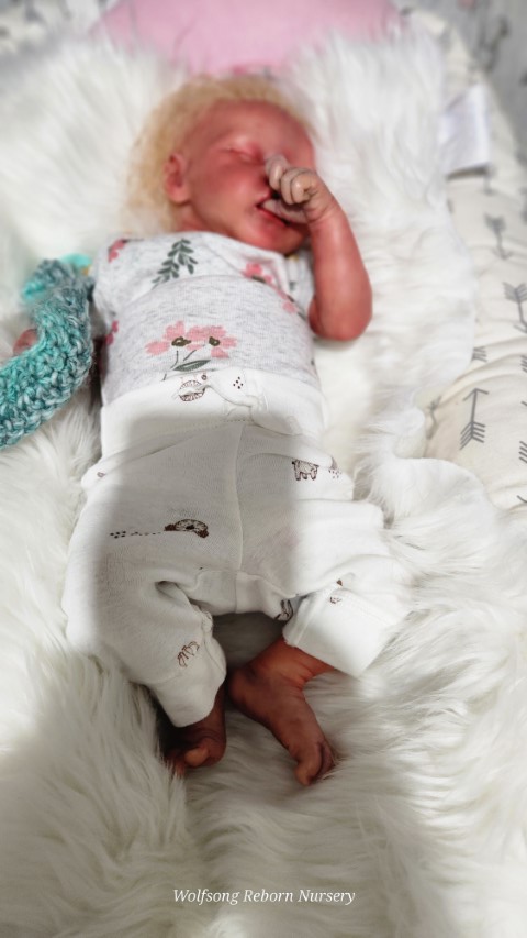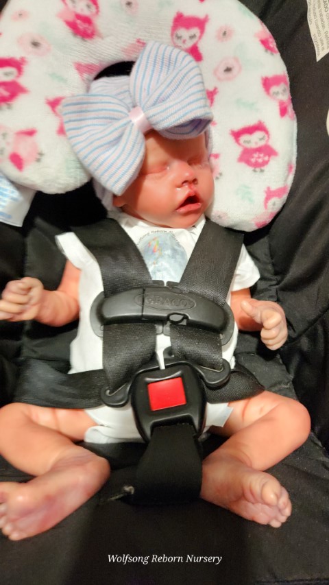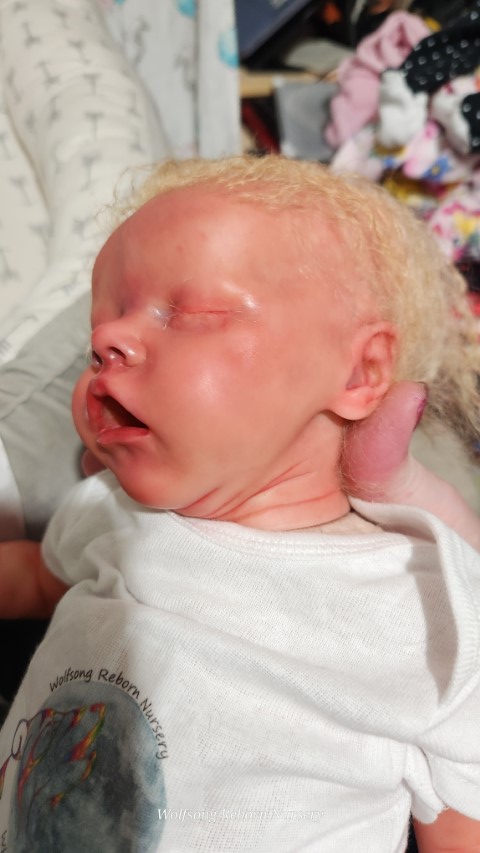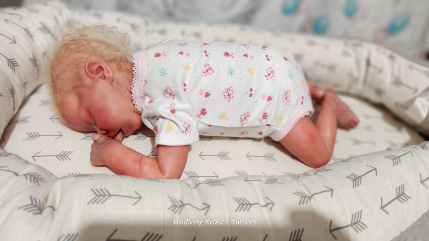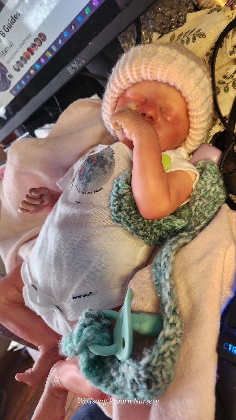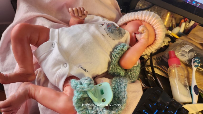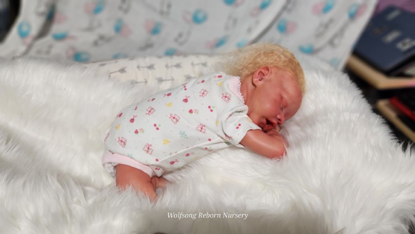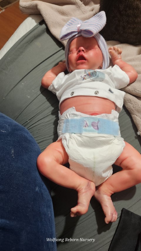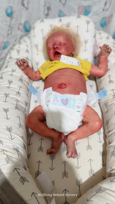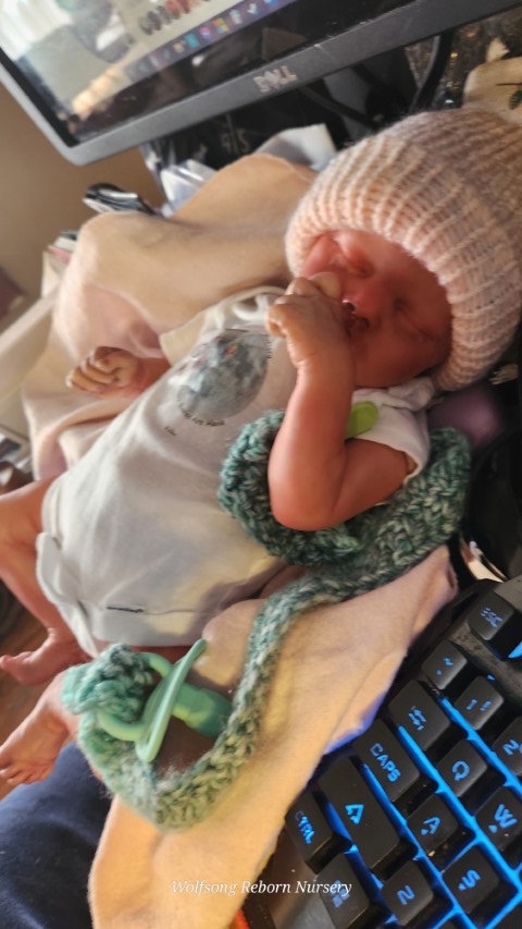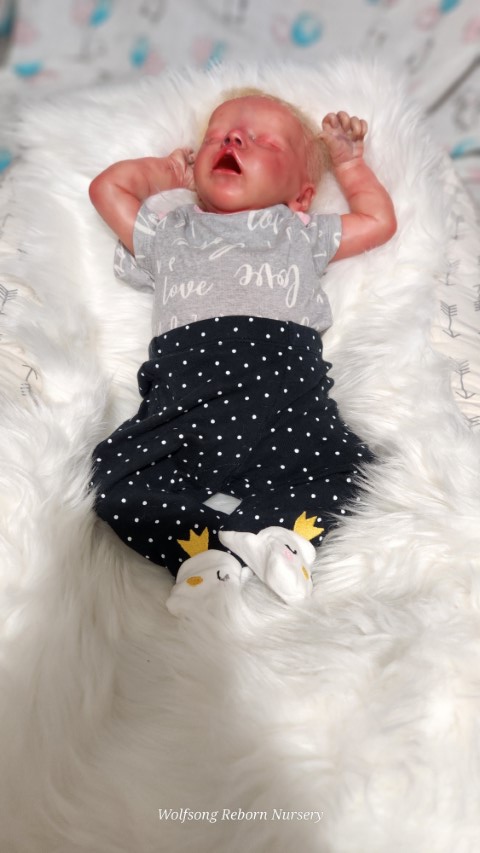 Rori has a belly plate complete with belly button and the wrinkles on her tummy. She has an open mouth that can accept a full size, newborn pacifier. Rori is hand rooted with beautiful, soft mohair from the beautiful Tammy O’Meara.