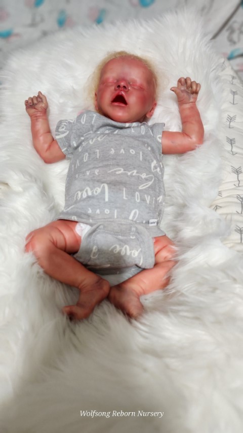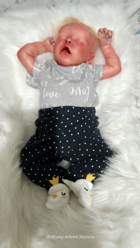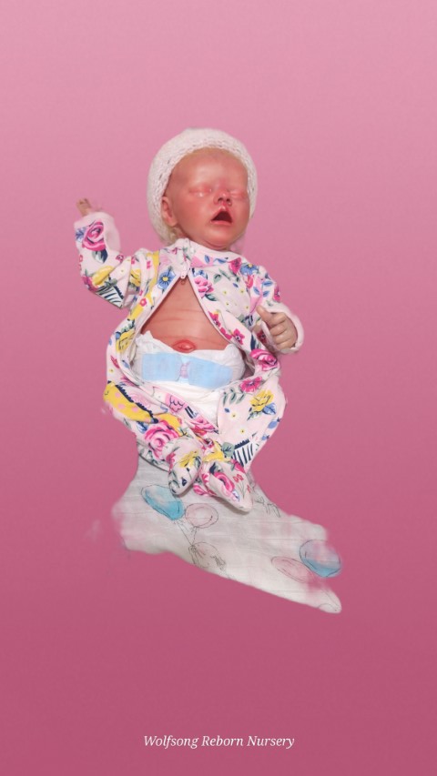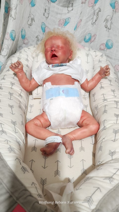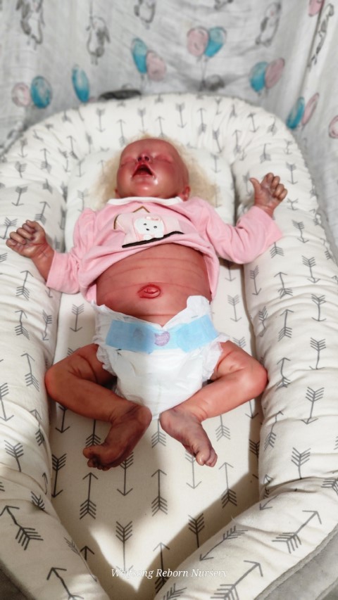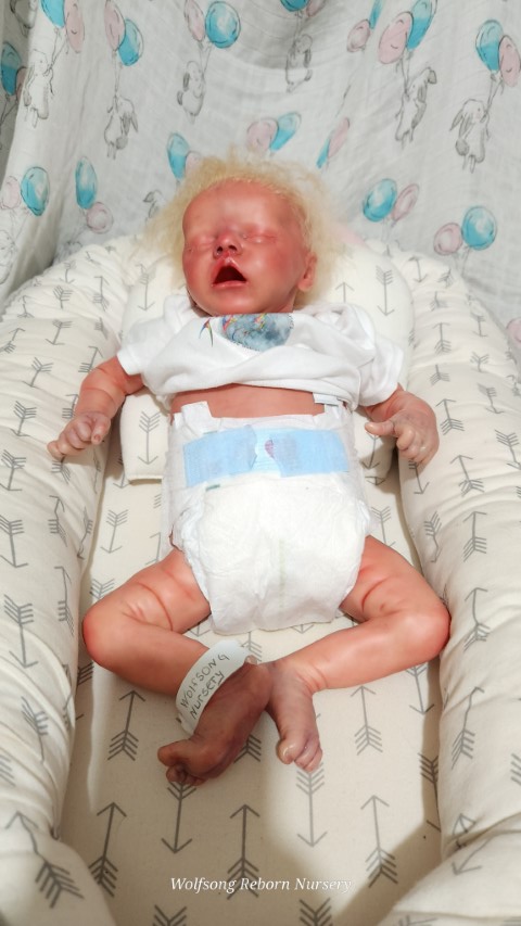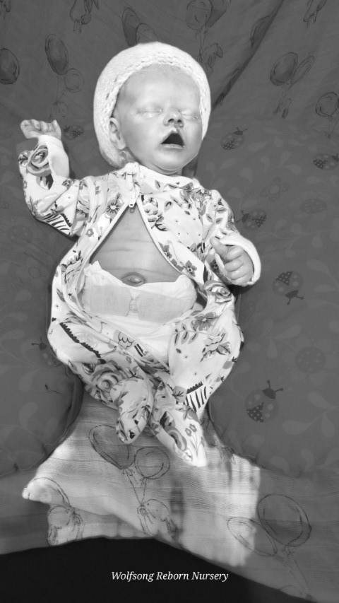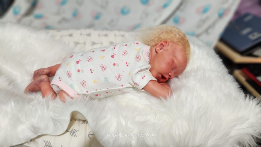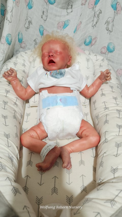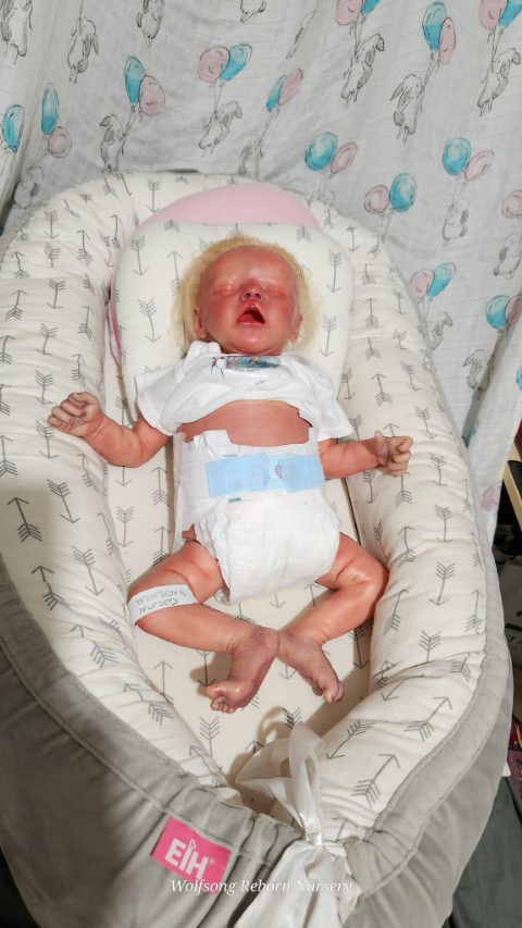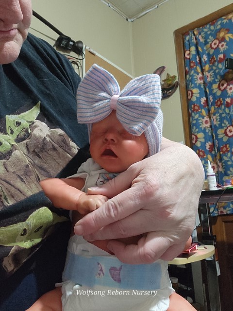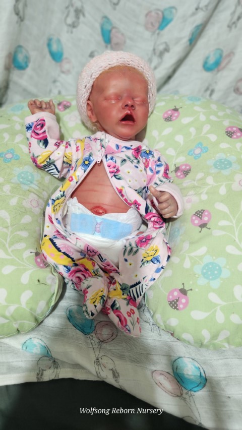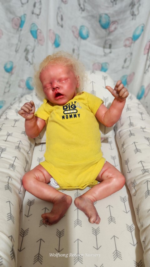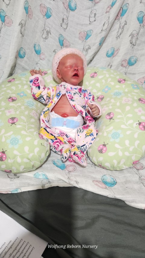 Rori has a belly plate complete with belly button and the wrinkles on her tummy. She has an open mouth that can accept a full size, newborn pacifier. Rori is hand rooted with beautiful, soft mohair from the beautiful Tammy O’Meara.