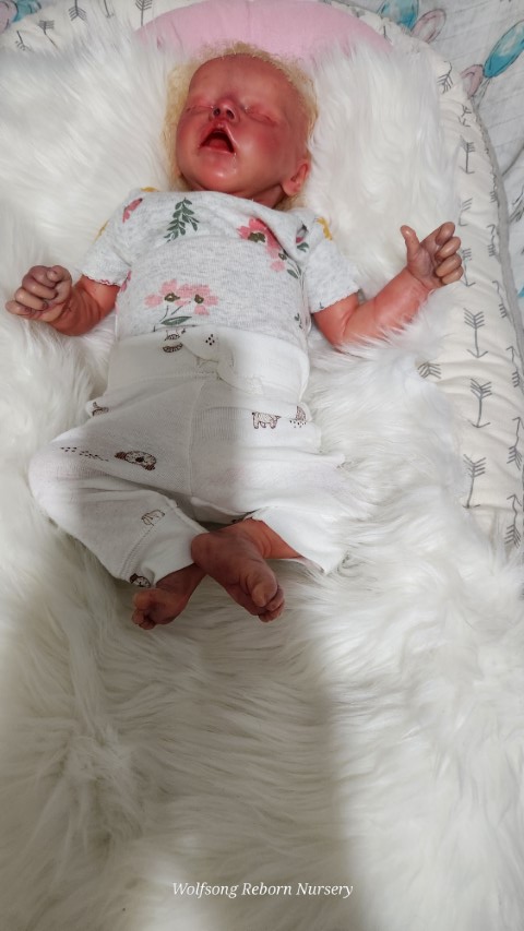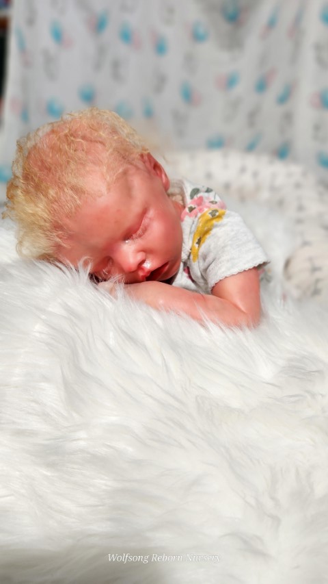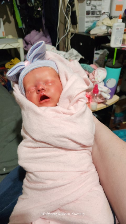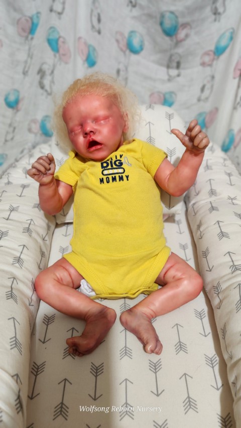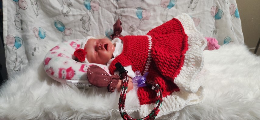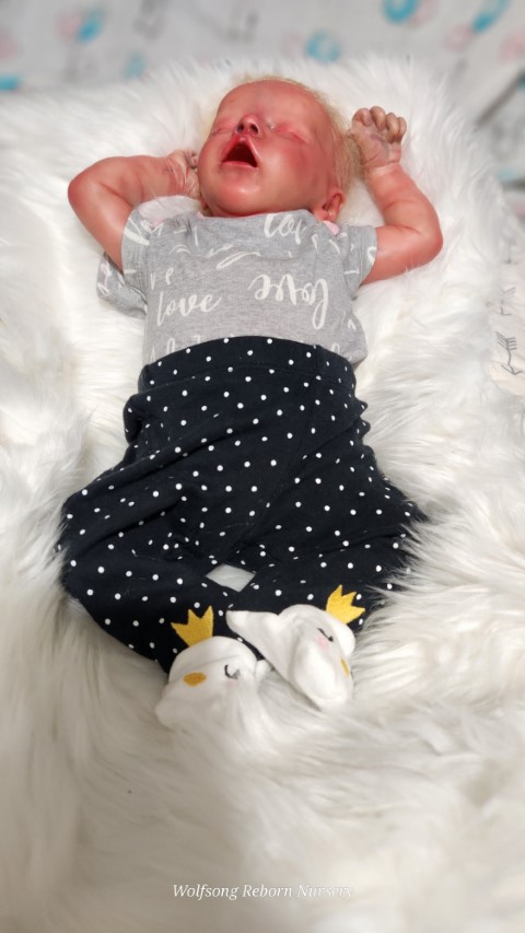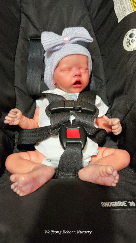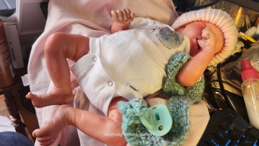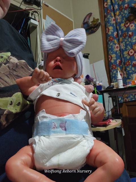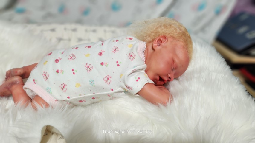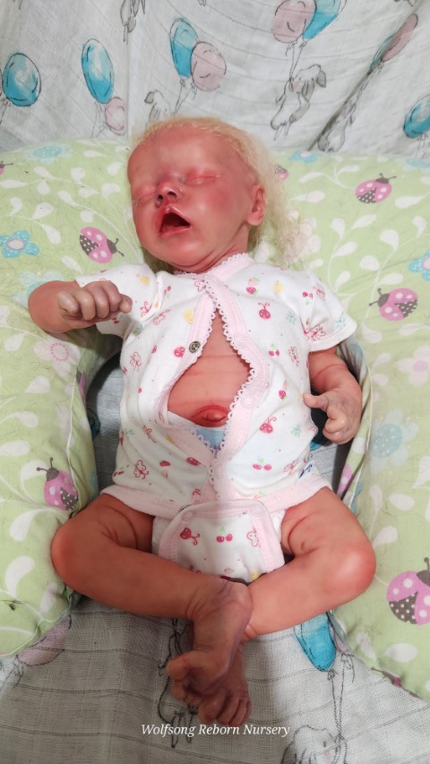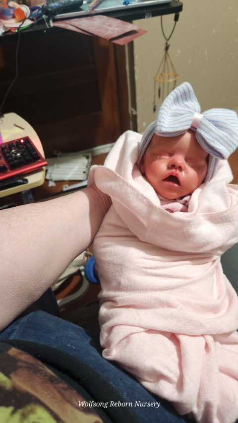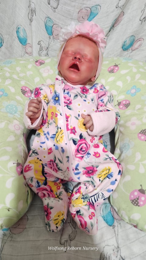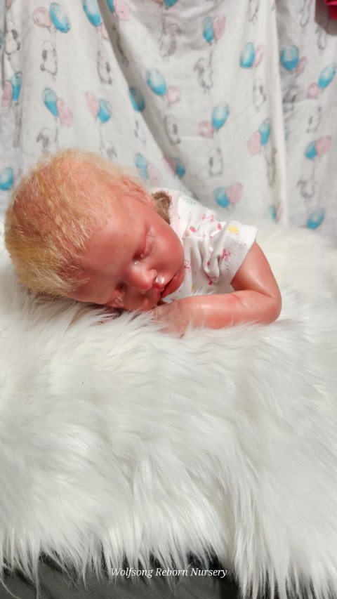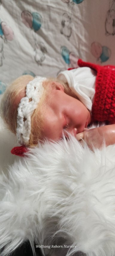 Rori has a belly plate complete with belly button and the wrinkles on her tummy. She has an open mouth that can accept a full size, newborn pacifier. Rori is hand rooted with beautiful, soft mohair from the beautiful Tammy O’Meara.