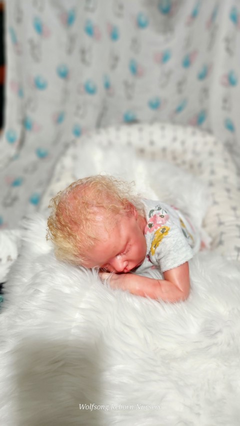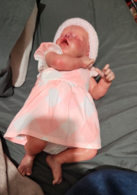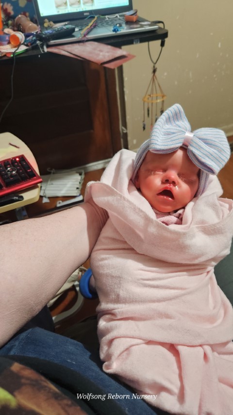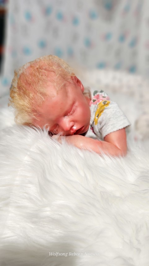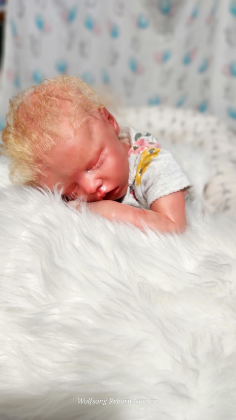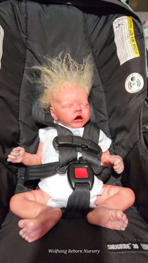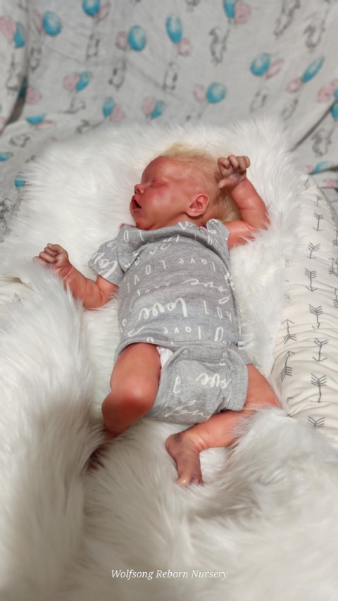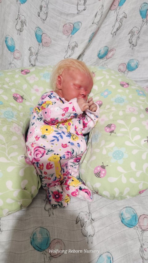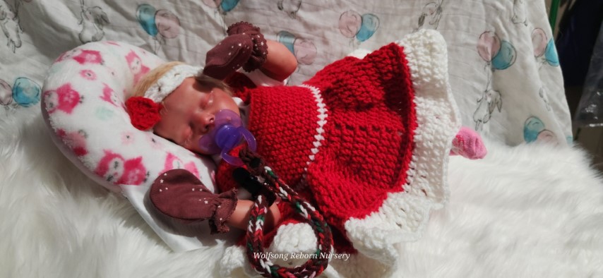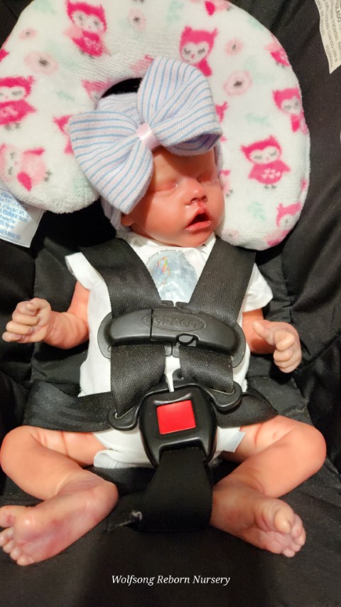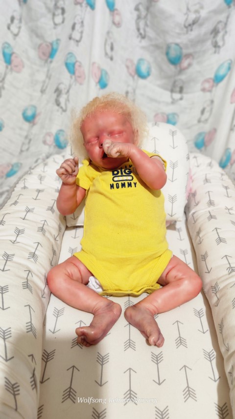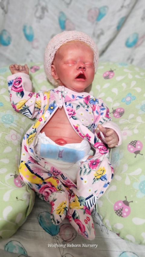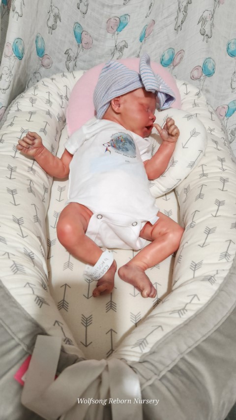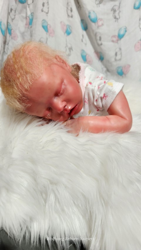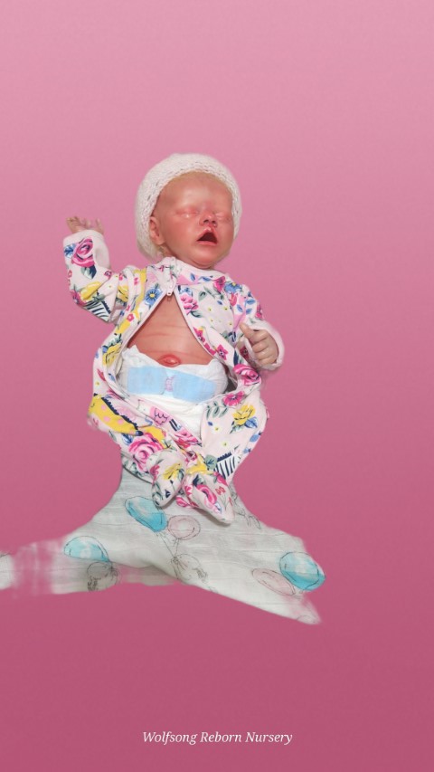 Rori has a belly plate complete with belly button and the wrinkles on her tummy. She has an open mouth that can accept a full size, newborn pacifier. Rori is hand rooted with beautiful, soft mohair from the beautiful Tammy O’Meara.