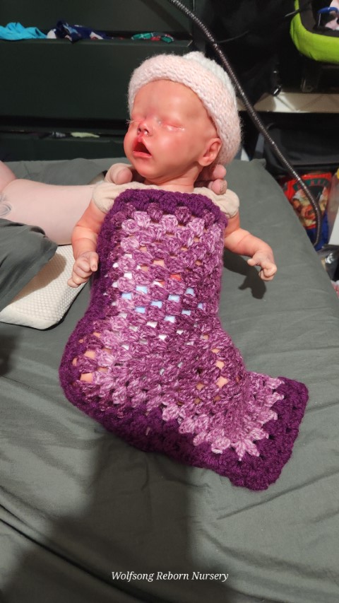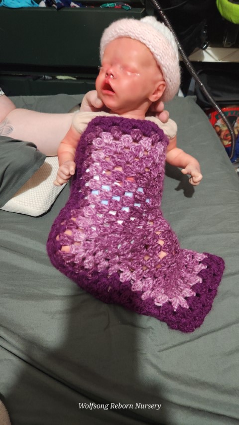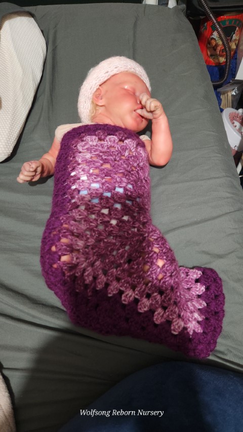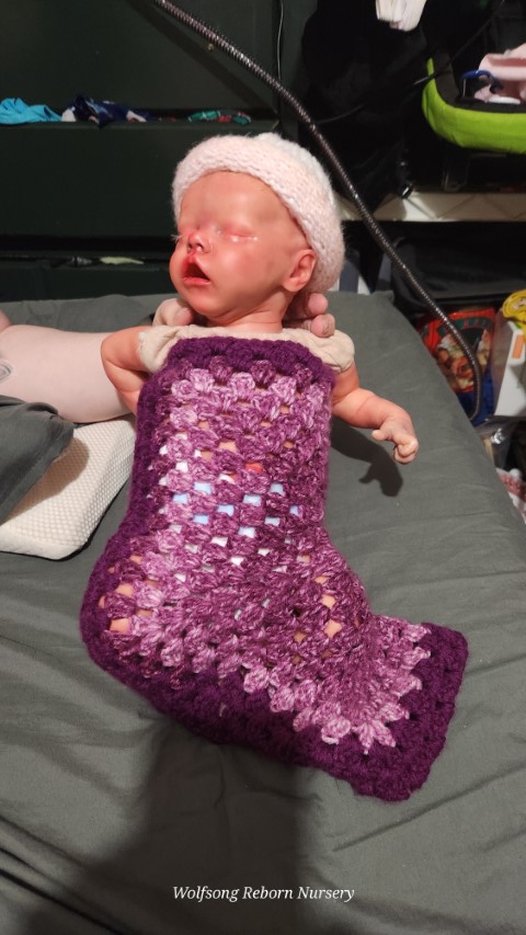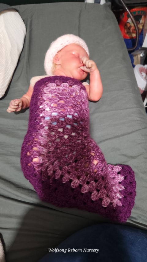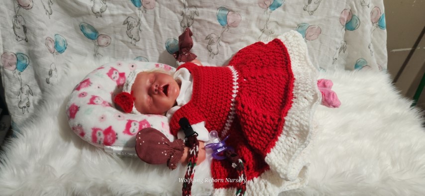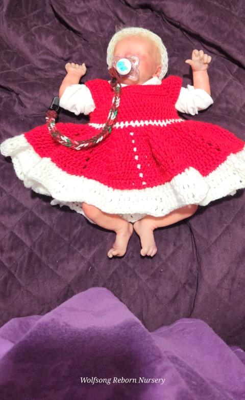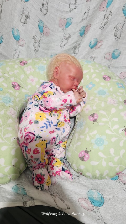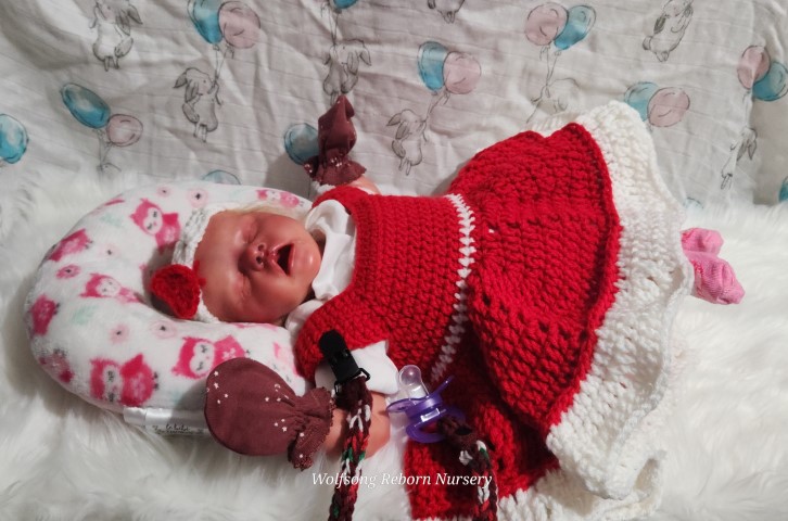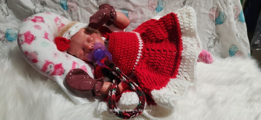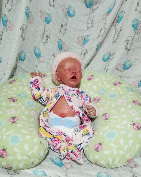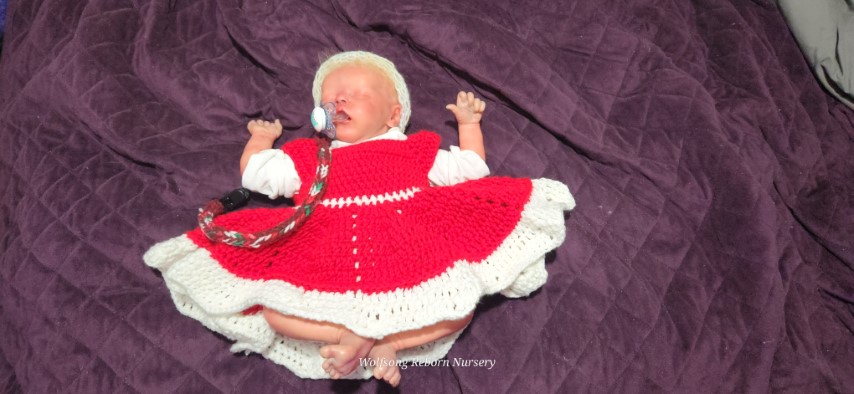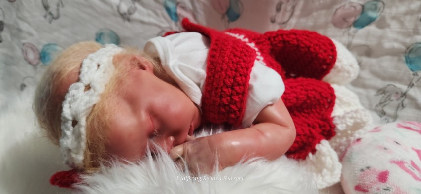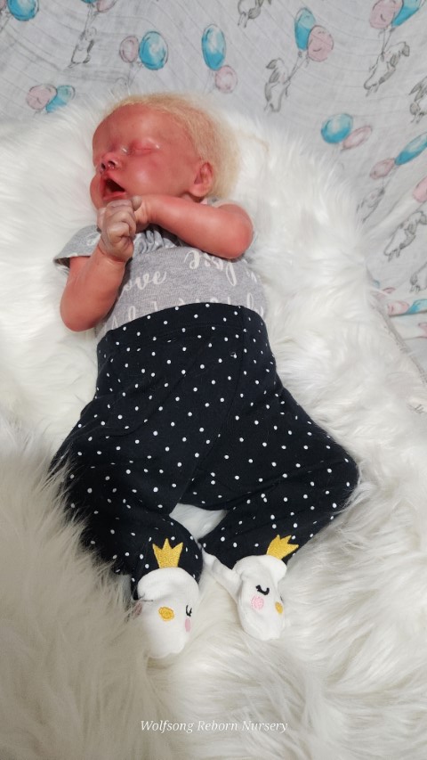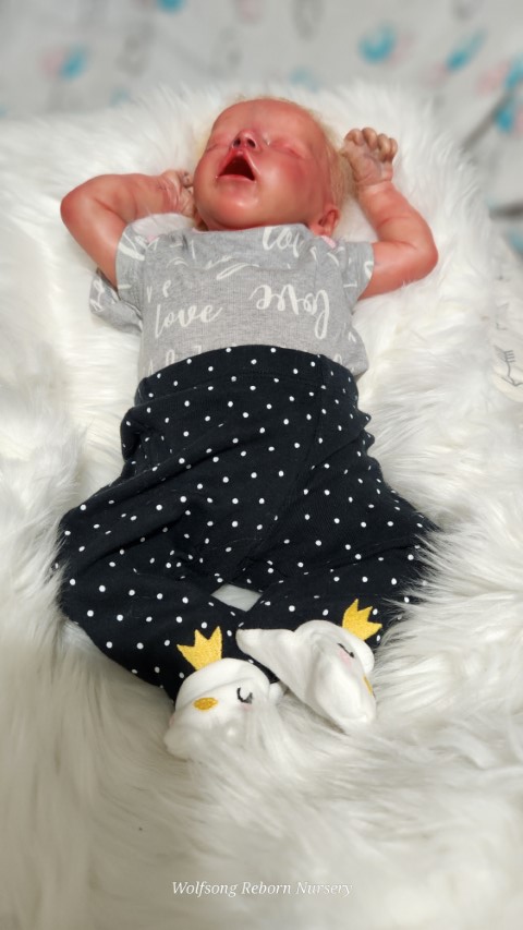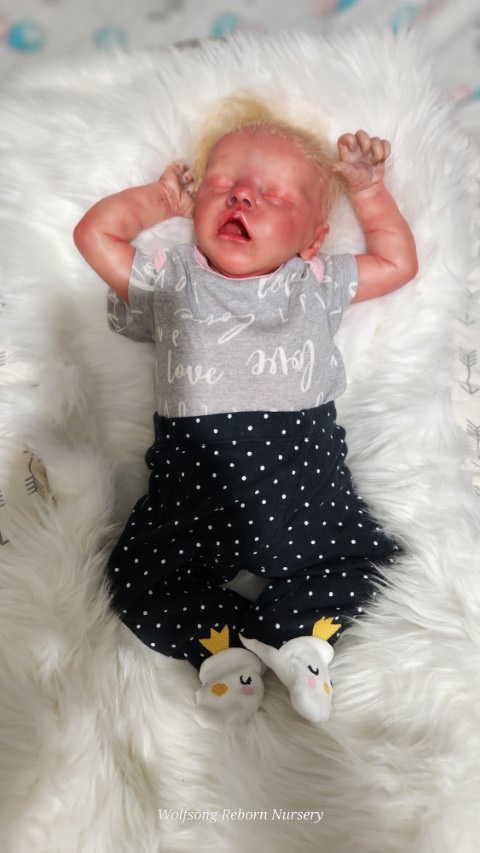 Rori has a belly plate complete with belly button and the wrinkles on her tummy. She has an open mouth that can accept a full size, newborn pacifier. Rori is hand rooted with beautiful, soft mohair from the beautiful Tammy O’Meara.