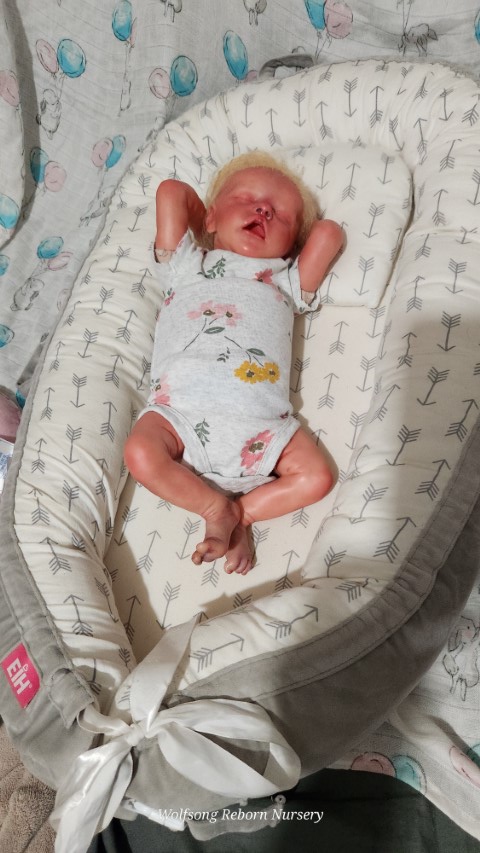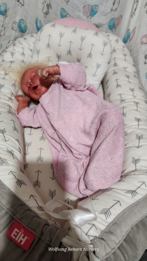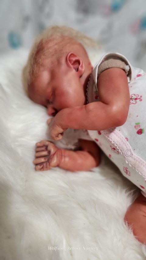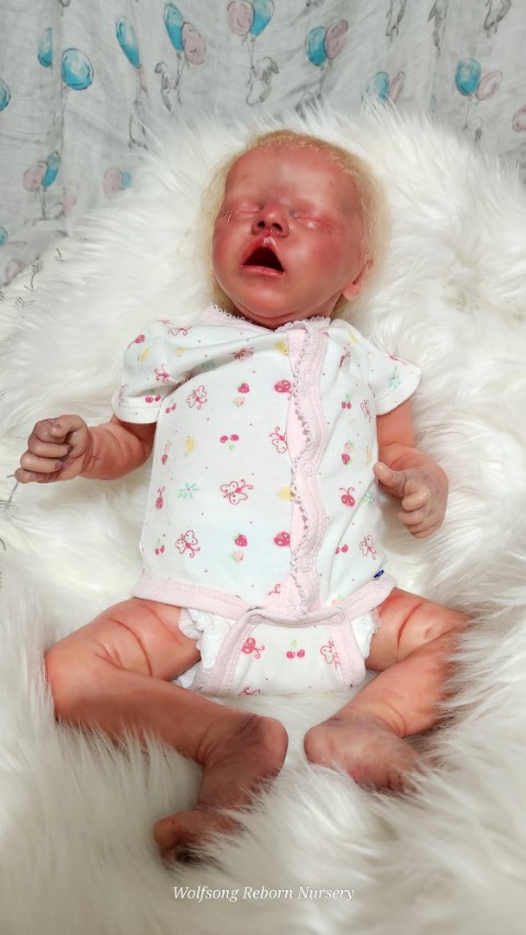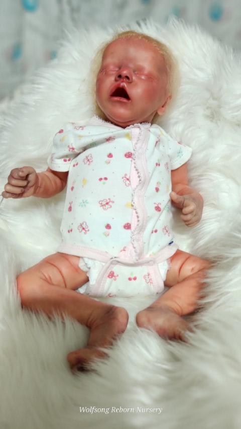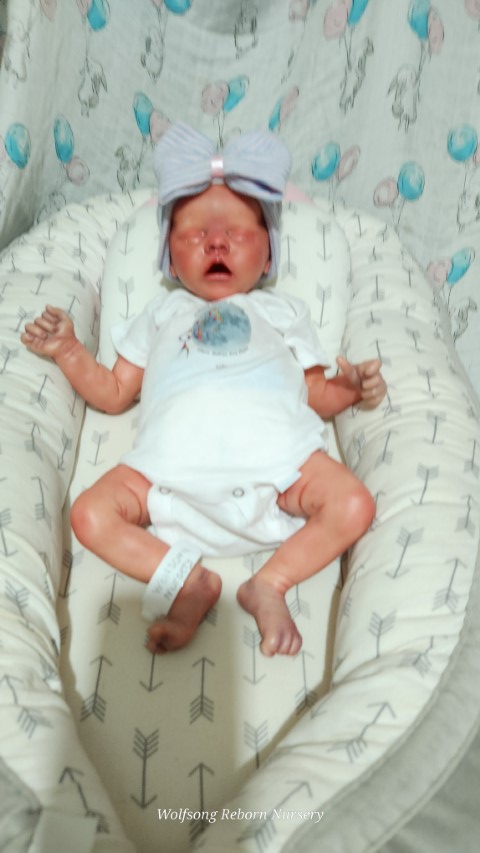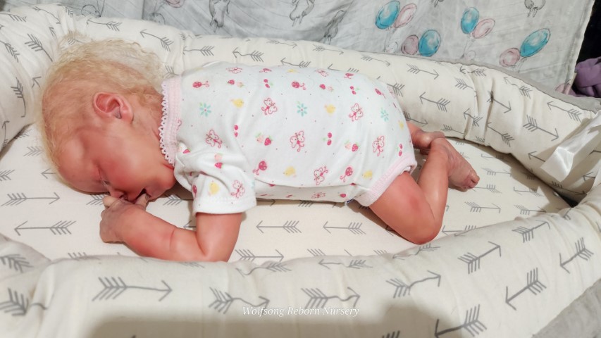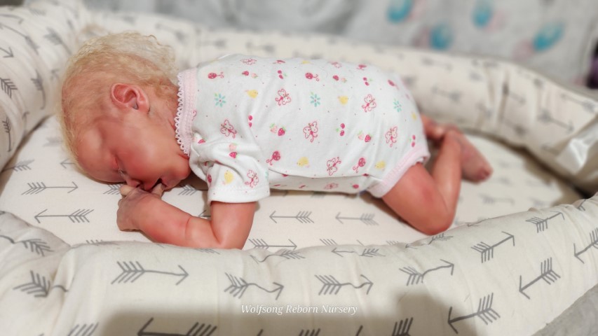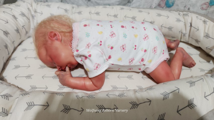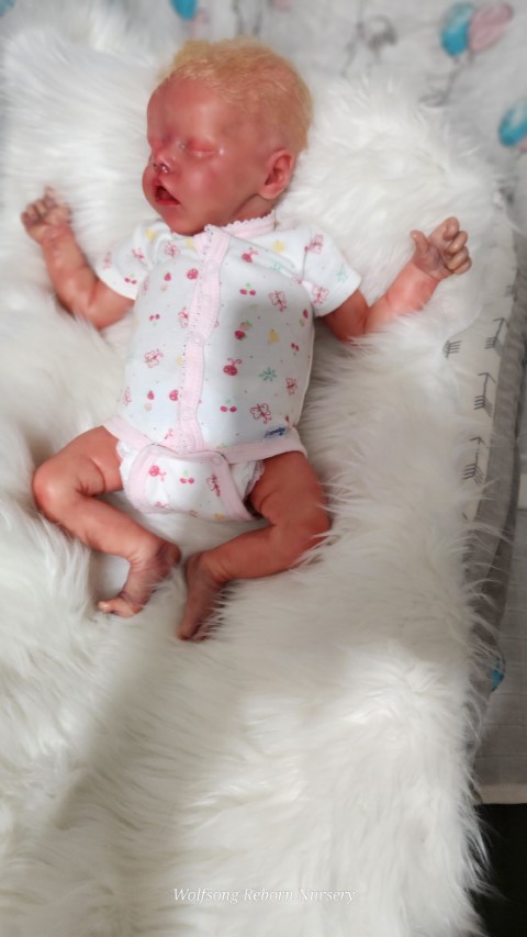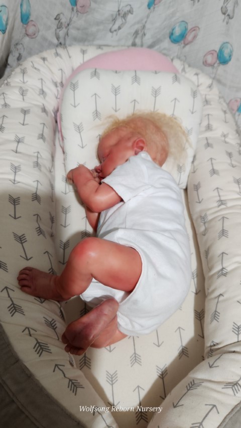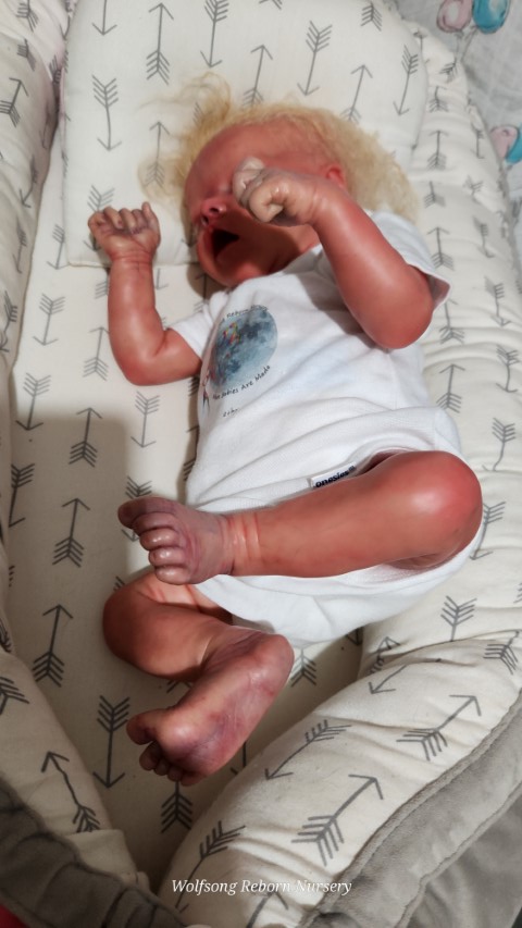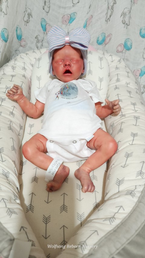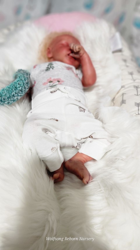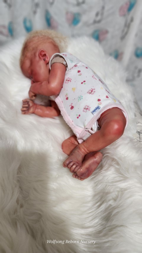 Aurora Bori Alice is on the beautiful Bonnie Browne Twin A kit and is painted with many layers of Genesis heat set paint, Coastal Scents and Pan Pastel Powders, two types of Polyfill, Silicone pads in bottom and tummy, and is painted to resemble a brand new, less than 5 minute old newborn baby. Hands and Feet are still dark because the blood hasn’t quite circulated, and she’s still red from her birth…she even has a blood drop on her heel and the wetness from her eyes.