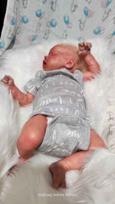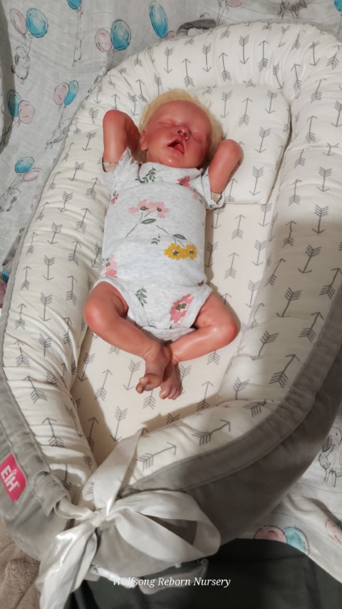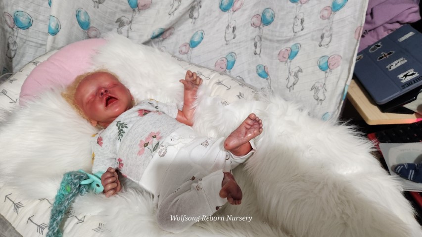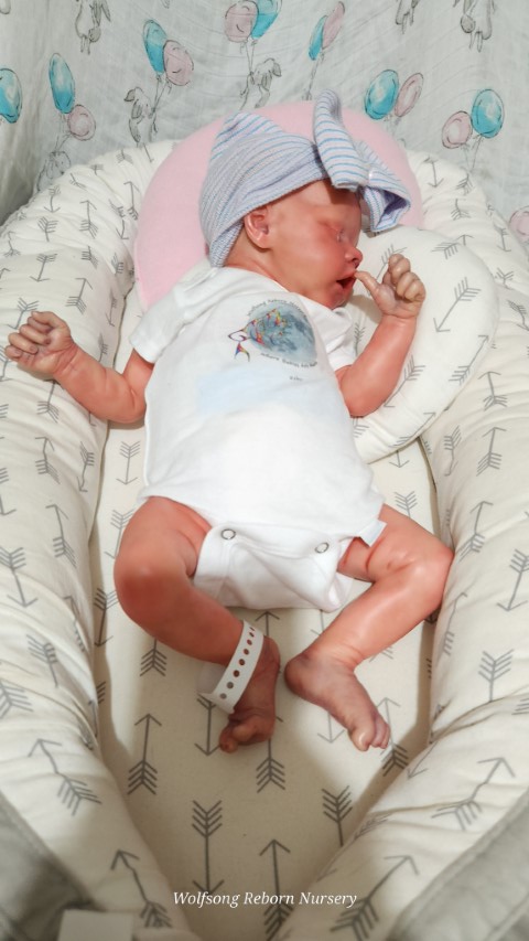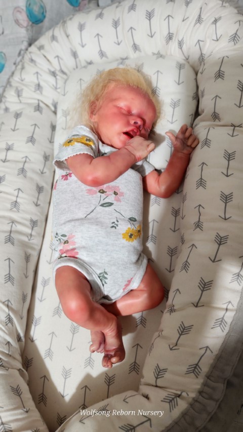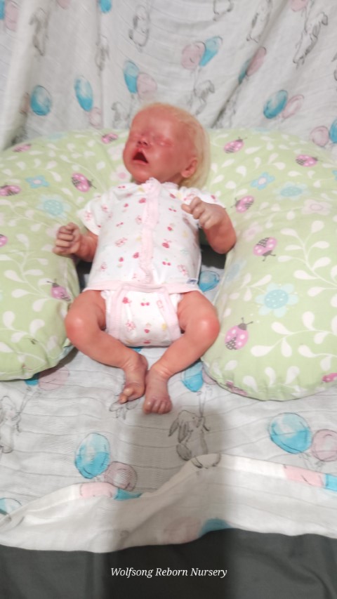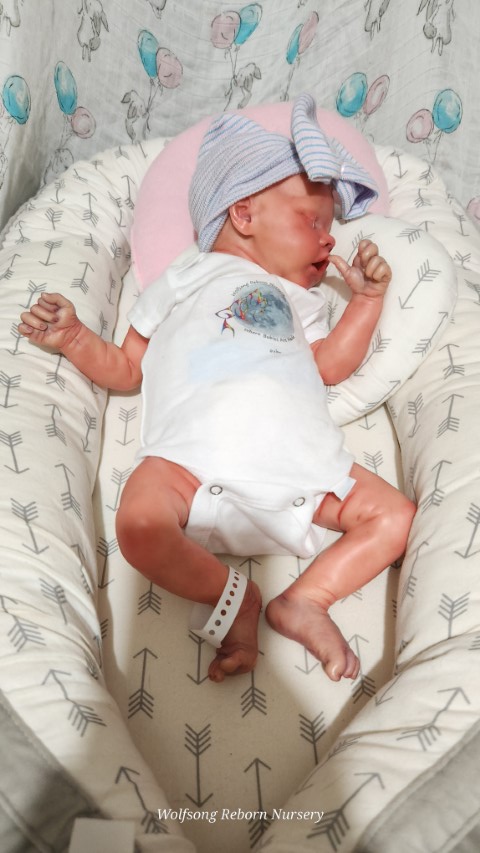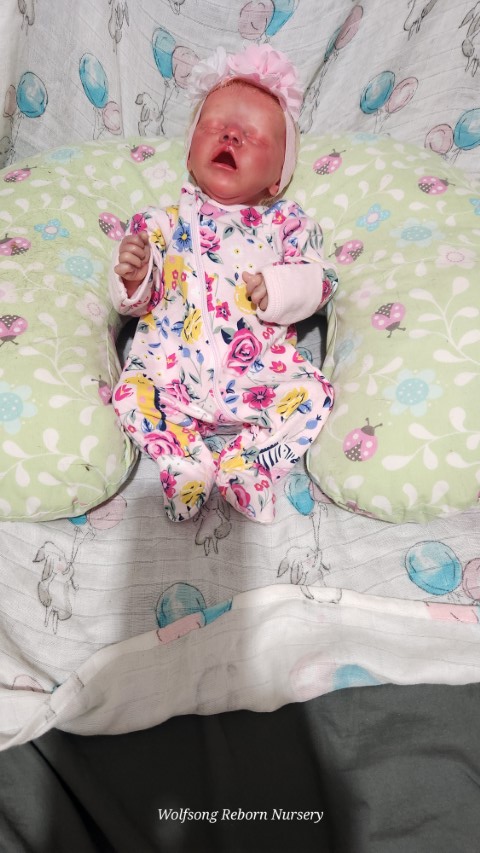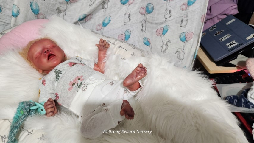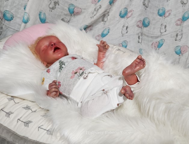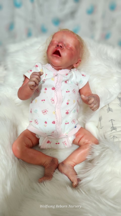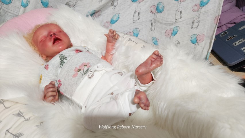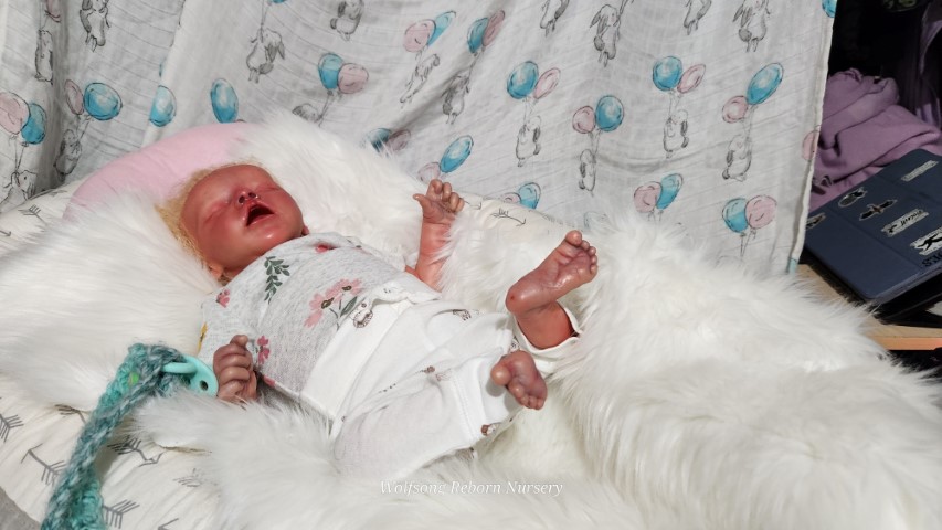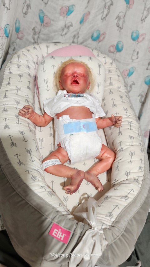 Aurora Bori Alice is on the beautiful Bonnie Browne Twin A kit and is painted with many layers of Genesis heat set paint, Coastal Scents and Pan Pastel Powders, two types of Polyfill, Silicone pads in bottom and tummy, and is painted to resemble a brand new, less than 5 minute old newborn baby. Hands and Feet are still dark because the blood hasn’t quite circulated, and she’s still red from her birth…she even has a blood drop on her heel and the wetness from her eyes.
