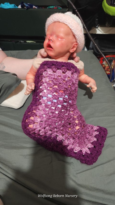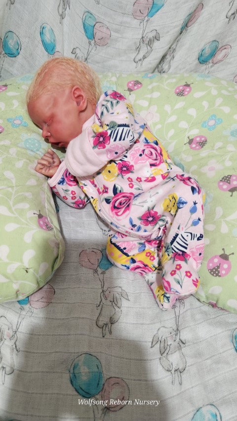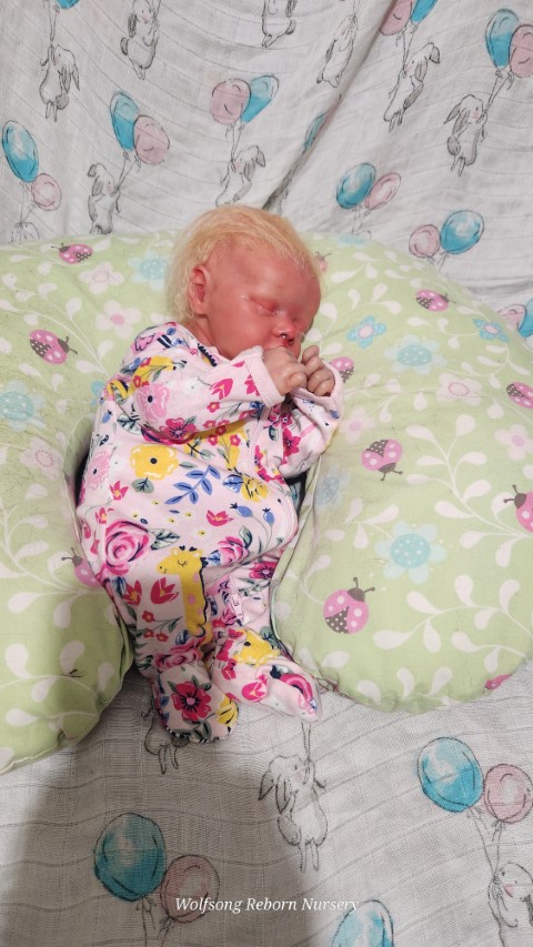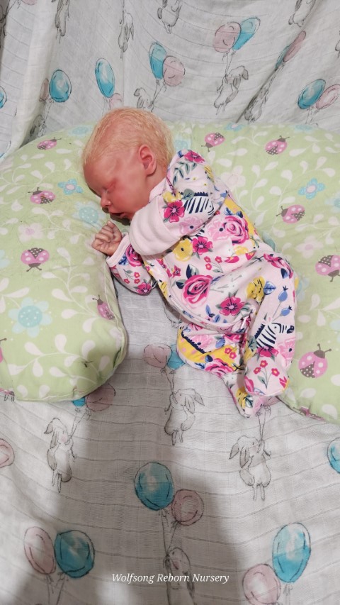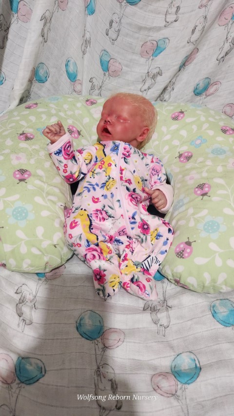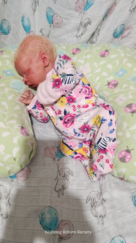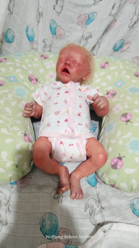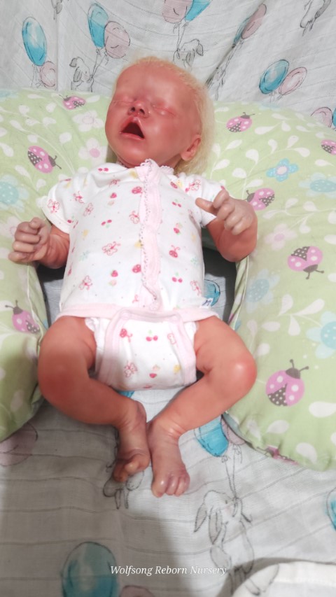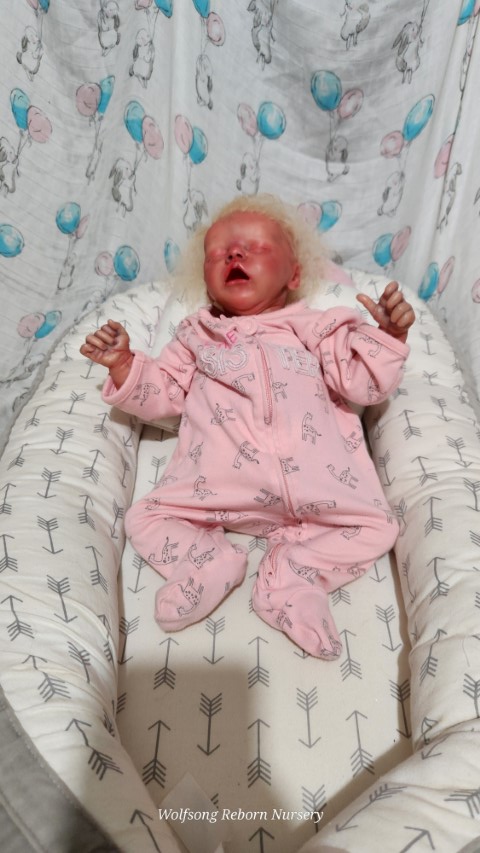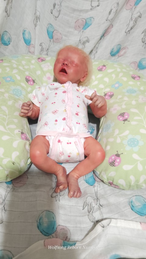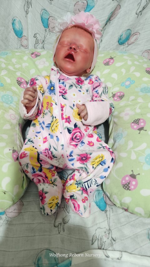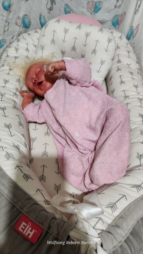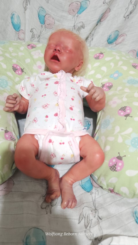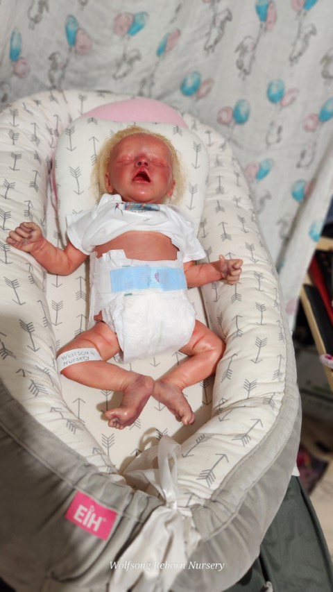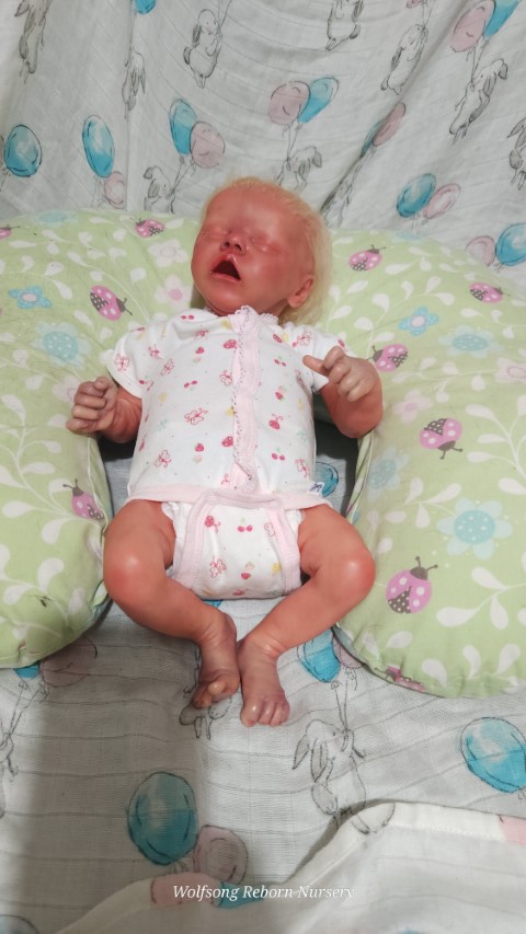 Aurora Bori Alice is on the beautiful Bonnie Browne Twin A kit and is painted with many layers of Genesis heat set paint, Coastal Scents and Pan Pastel Powders, two types of Polyfill, Silicone pads in bottom and tummy, and is painted to resemble a brand new, less than 5 minute old newborn baby. Hands and Feet are still dark because the blood hasn’t quite circulated, and she’s still red from her birth…she even has a blood drop on her heel and the wetness from her eyes.